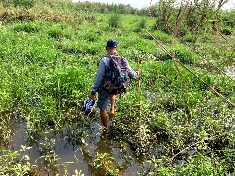 Ein bisschen mulmig ist mir schon, auch wenn wir in einer Gruppe aus drei Personen unterwegs sind. Das ist eben kein Zoo mehr. Hier gibt es keinen schützenden Zaun. Wenn man hier rumläuft wird man quasi automatisch zu einem Teil der Nahrungskette – und zwar nicht zu dem Teil der ganz oben steht. Aber Madhup winkt nur ab. Dass man hier mal Tigerspuren sieht sei ganz normal. Ich soll mir keine Sorgen machen.