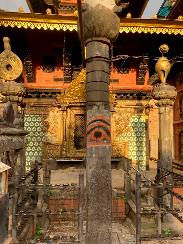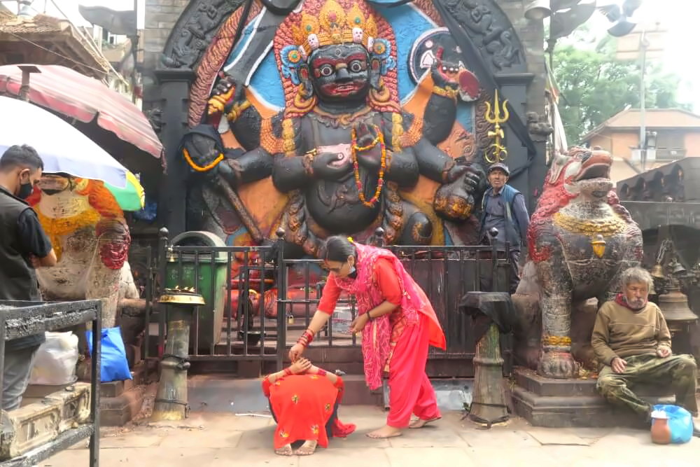 Der Durbar Square ist der Hauptplatz vor dem ehemaligen Königspalast von Kathmandu und zählt zum UNESCO-Weltkulturerbe. Rund um den Platz findet sich eine Vielzahl von Pagoden, Palästen und etliche Hindu-Tempel, die auch noch genutzt werden. Auf dem Platz sind daher zu jeder Tageszeit viele gläubige Hindus anzutreffen, z.B. vor der etwas gruseligen Statue von Kala Bhairava.
