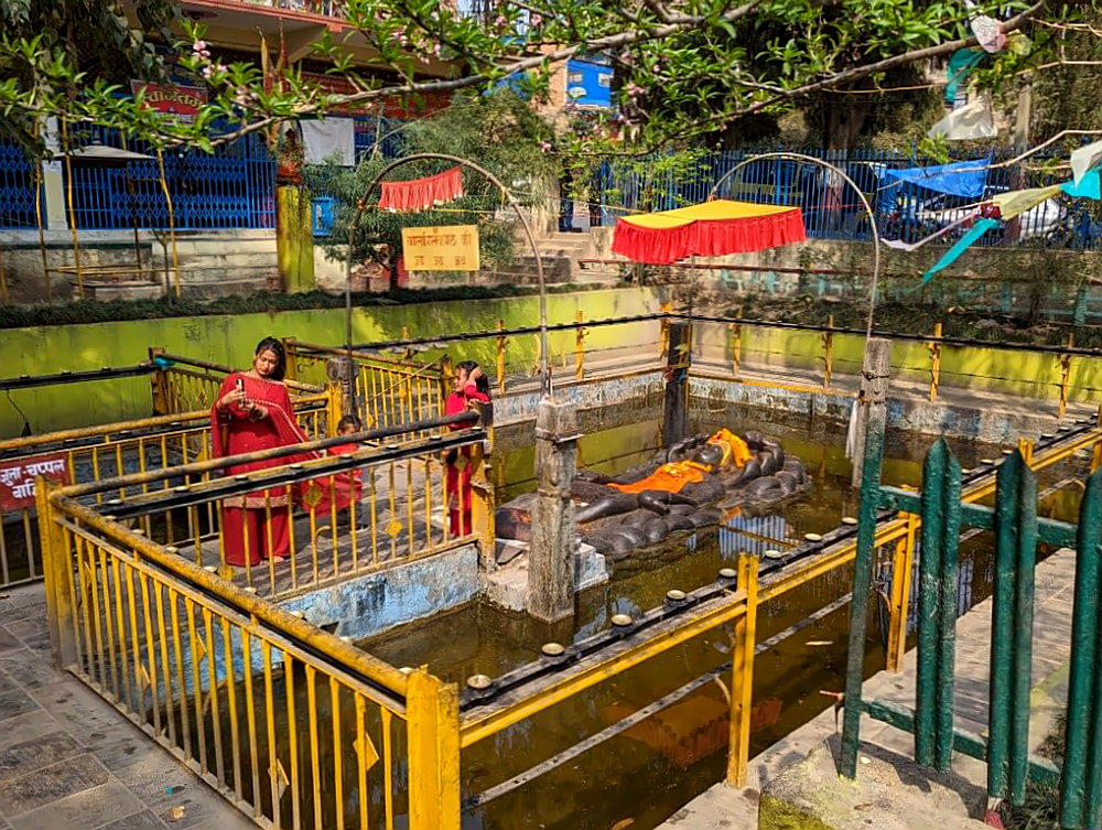 Die Tempelanlage befindet sich mitten in Budhanilkantha, der Zugang zum inneren Bereich ist wieder nur für Hindus erlaubt. Der Rest muss an einer Absperrung rund um den Teich haltmachen, von wo aus sich aber auch sehr gute Blicke auf den Gott bieten. Die Stimmung hier ist toll, ganz anders als in den bekannten Tempeln, weil hier nur sehr wenige westliche Touristen vorbeikommen. Eintritt muss hier auch nicht gezahlt werden.