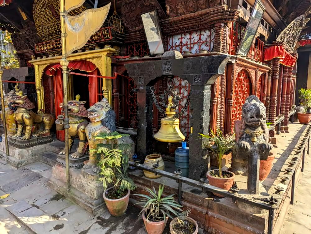 Tipp: Ein sehr schöner Spaziergang führt vom Durbar Square nach Westen bis zu dem künstlichen See Pimbahal Pokhari. Hier gibt einen Shiva-Tempel auf einer Halbinsel und ein paar nette Cafés zum Hinsetzen und Leute beobachten. Ein toller Ort mit entspannter Atmosphäre und kaum Verkehr.