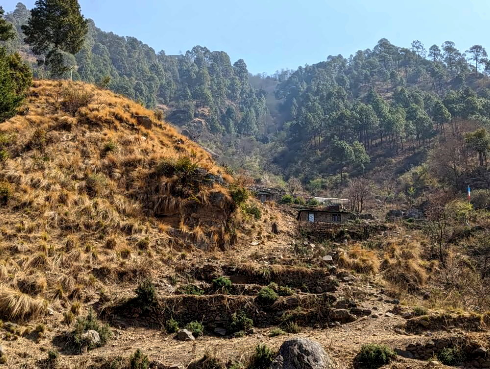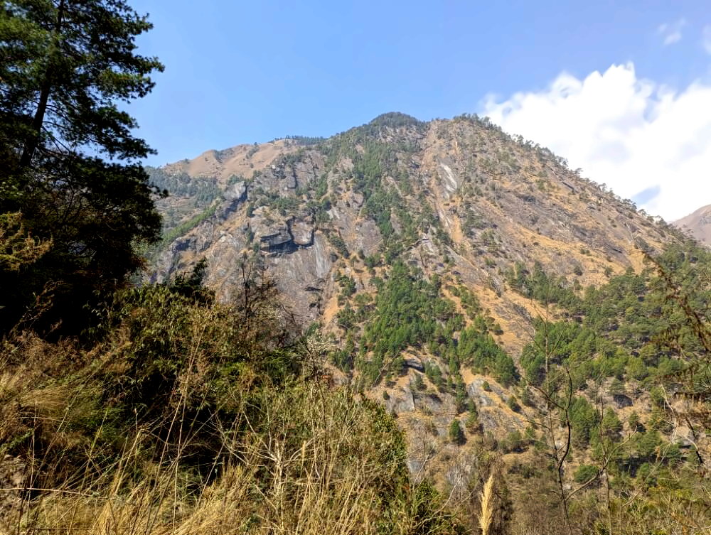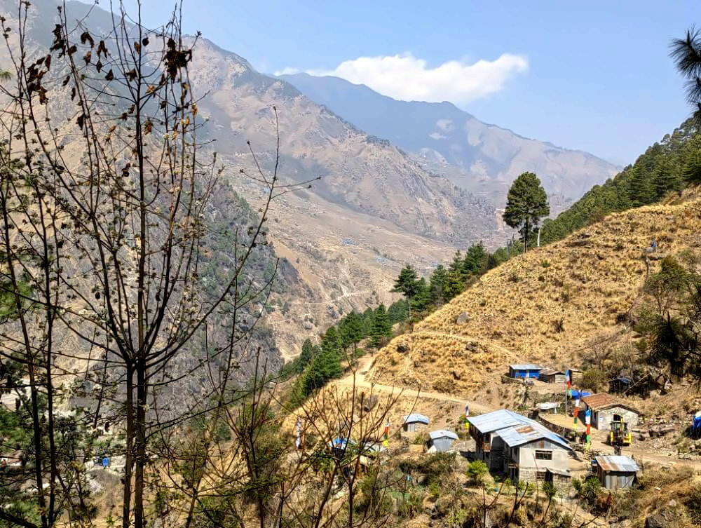 Der Weg folgt teilweise einer neugebauten Dirtroad zu dem höhergelegen Dorf Khangjim, zwischen den Serpentinen wurden aber diverse Trampelpfade als Abkürzungen angelegt. In Bhanjyang gönne ich mir eine Pause in dem Hotel Mountain View. Danach laufe ich auf einem schönen Naturpfad durch Wäldchen aus duftenden Himalaya-Kiefern, schließlich öffnen sich ersten Mal die Blicke: Im Süden steile bewaldete Hänge über dem Flusstal, weit vor mir in der Ferne eine Reihe von schneebedeckten Gipfeln – das obere Langtang. Hat sich doch gelohnt, hier hoch zu marschieren!