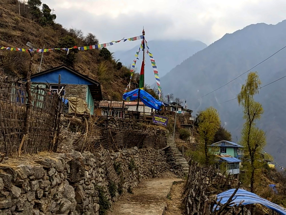 Der Weg bis Langtang durch das erdrutschgefährdete Stück ist gut markiert. In dem Ort bleibe ich nicht und laufe direkt weiter – ein langgezogener sanfter Anstieg, die 400 Höhenmeter fallen gar nicht weiter auf. Unterwegs komme ich an vielen Mauern aus Mani-Steinen vorbei. Die mit Mantras in Sanskrit bemalten Steinmauern sind ein sicheres Zeichen, dass man jetzt endgültig im buddhistischen Teil des Himalaya angekommen ist.