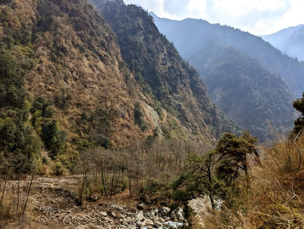 Vor dem nächsten Ort Ghoda Tabela tritt ein langsamer Wandel ein. Der Wald bleibt zurück, die Vegetation verwandelt sich in niedriges Buschland und die Berge treten immer deutlicher hervor. Ab hier offenbart sich auch der eigentliche Reiz des Langtang Valley: Durch den schlangenförmigen Verlauf des Tals wird der Betrachter förmlich in die Tiefe hineingezogen. Man kann immer nur ein paar Kilometer geradeaus schauen, dann versperrt eine Kurve den Blick und man möchte wissen, wie es dahinter aussieht.