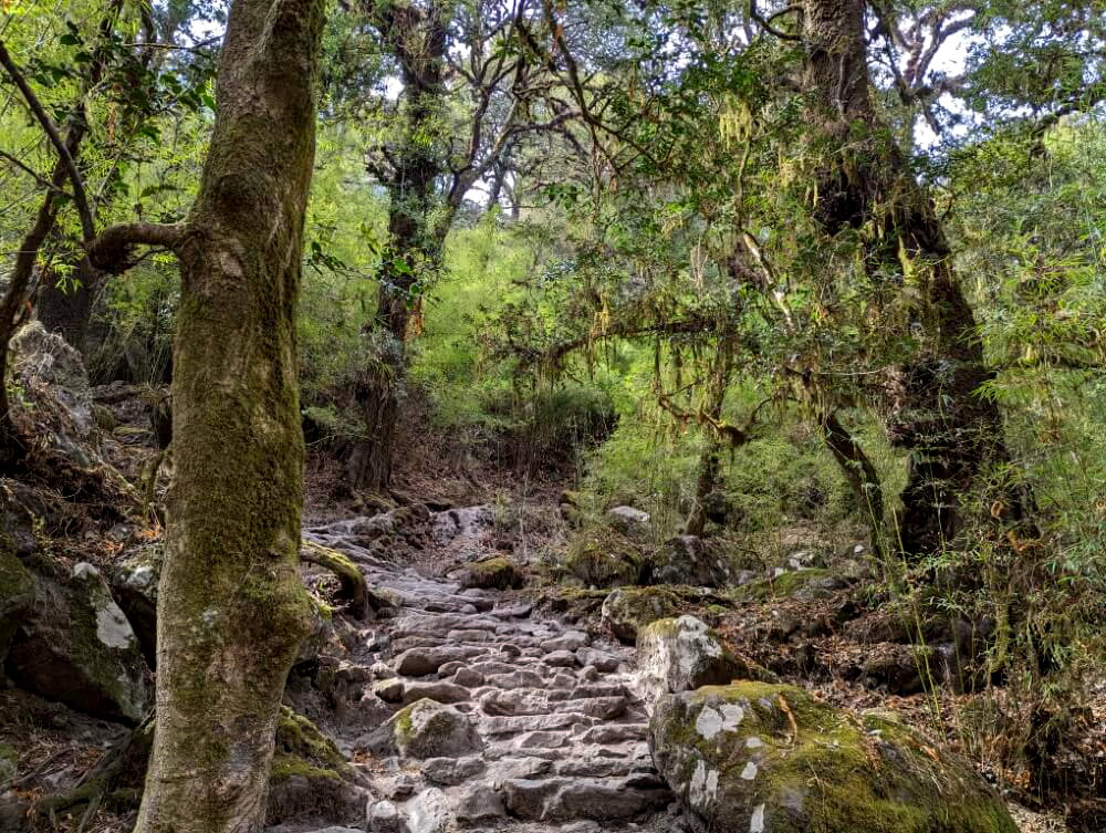 Meine Erkältung ist leider nicht besser geworden, also muss ich es heute etwas langsamer angehen. Zum Glück geht es mit einem kurzen Abstieg nach Rimche los, das ich bereits 15 Minuten später erreiche. Hier trifft mein Höhenweg auf die Hauptroute im Tal, der Unterschied ist sofort spürbar. Nicht nur weil ich hier das erste Mal andere Leute sehe. Während man weiter oben gigantische Panoramaaussichten genießt, ist der Blick auf die hohen Berge am Grund des engen Tals komplett versperrt.