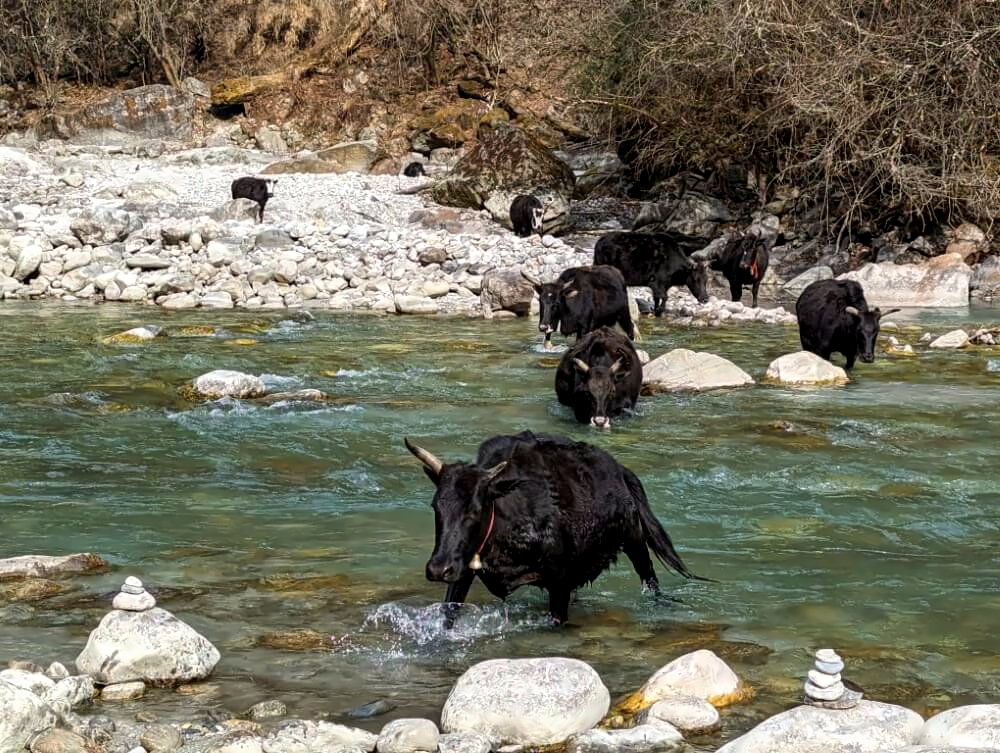 Anschließend geht es in sanftem Auf und Ab auf angenehm zu laufenden Waldwegen weiter, bis ich an der Riverside Lodge ankomme. Die klassische Nepal-Backpacker-Lodge, ein paar einfache Hütten direkt am Weg. Gewaschen wird im Freien mit kaltem Wasser, Internet gibt’s auch nicht. Dafür eine große Kiesbank, wo gerade ein paar zottige Yaks dabei sind, den Fluss zu überqueren. Einen halben Kilometer weiter gäbe es noch das etwas komfortablere Hotel Woodland. Aber mir gefällt das hier sehr gut, also bleibe ich.