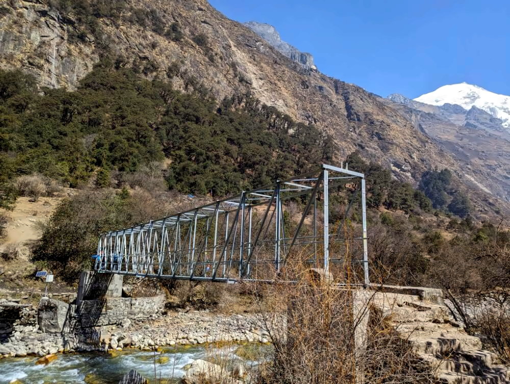 Ein weiterer kurzer Tag, die 9 Kilometer bis nach Langtang sind mir mit der Erkältung etwas zu viel. Kurz hinter dem Woodland Hotel wird der Langtang Khola über eine neue Brücke aus Metall überquert – gestiftet von niemand anderem als dem deutschen Alpenverein, wie ich zu meiner Überraschung feststelle. An dieser Stelle zweigt links ein Pfad ab. Der ist aber in ziemlich schlechtem Zustand und – so haben es mir die Leute in der Woodland Lodge gesagt – von Erdrutschen und Lawinen bedroht, weil er direkt unterhalb einer steilen Bergflanke verläuft. Die offizielle Route ist der rechte Weg.