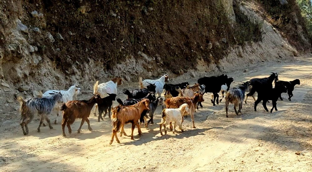 An einem kleinen Sattel auf knapp 2.800 Metern beginnt eine Dirtroad, die nicht ganz bis Sherpagaon reicht – zumindest noch nicht. Ein erklärtes Ziel der Regierung Nepals ist, dass früher oder später alle Dörfer eine Straßenanbindung erhalten, auch die entlegenen Orte in den Bergen. Daher werden so gut wie überall Straßen gebaut – teilweise auch auf den Trekkingrouten.