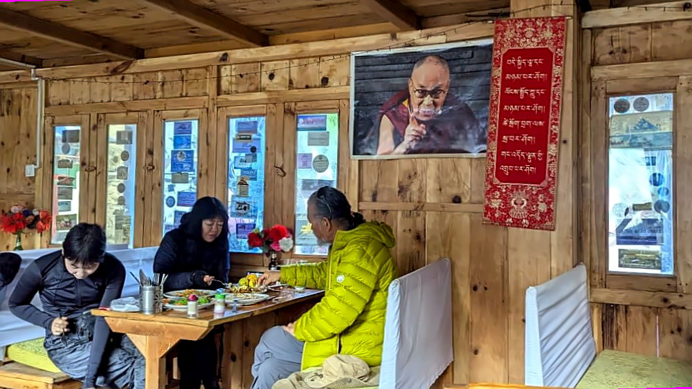 Unser Mittagessen in Ghap nehmen wir unter den wachsamen Augen des Dhalai Lama ein, sein Porträt sehen wir jetzt immer häufiger. Ich frage Prakash, ob er Hindu oder Buddhist ist. Er erzählt, dass er eigentlich aus Solukhumbu kommt, der Heimat der Sherpa, und Buddhist ist. Aber, so fügt er augenzwinkernd hinzu, in Nepal gibt es drei Religionen: Buddhismus, Hinduismus und Tourismus. Er ist überzeugter Anhänger der dritten Glaubensrichtung.