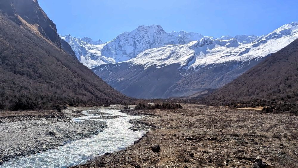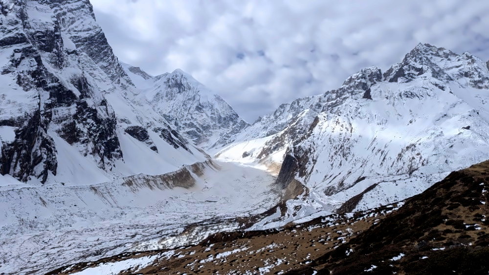 In Samagaon war es schon sehr kalt, danach betreten wir endgültig die eisige Gebirgswelt des hohen Himalaya. Die Umgebung verwandelt sich in eine Art Wüste, unsere Welt scheint jetzt nur noch aus grauen Felswänden und den Brauntönen der kargen Hügel zu bestehen. Außerdem nimmt die Luft eine beißende Schärfe an, die wir mit jedem Atemzug in unseren Lungen spüren.