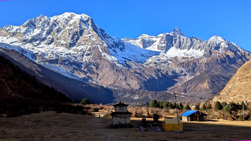 Noch vor dem Örtchen Namrung zweigt das abgeschiedene Tsum Valley ab (ca. 5-6 Tage zusätzlich). Danach öffnet sich die enge Schlucht zu einem weitläufigen Hochtal, die gewaltigen schneegekrönten Berge an der Grenze zu Tibet beginnen nun die Szenerie zu dominieren. Ab hier betritt man auch den buddhistisch geprägten Kulturraum. Auf der Wanderung zum letzten größeren Ort Samagaon wandern wir direkt unterhalb der Nordflanke von Manaslu – vielleicht das landschaftliche Highlight des Treks.