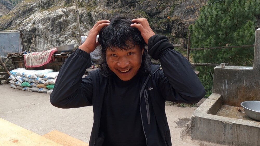 „Was machst du sonst so?“ wollen wir wissen. Eine ganze Menge, wie sich herausstellt: Prakash hat eine Lizenz als Mountain Guide, war schon auf dem Gipfel von Ama Dablam und in den oberen Everest-Camps und ist Sprecher einer lokalen Tourismusorganisation. Den Knaller finde ich aber, dass er auch noch in Musikvideos singt, wenn sonst nichts geht. Er seufzt. „Wenn ich doch nur eine echte Lederjacke hätte… dann würde ich richtig groß auf YouTube rauskommen.“ Okay, vorgemerkt. Da haben wir doch schon unser Abschiedsgeschenk…