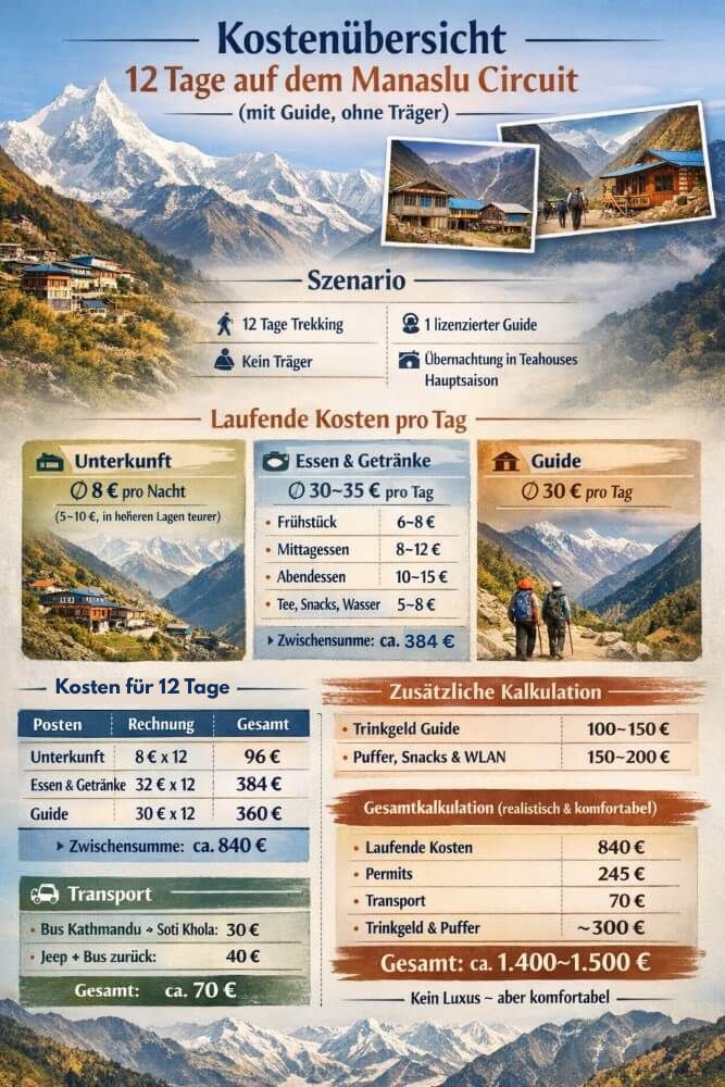 Die Gesamtkosten für den Manaslu Circuit liegen je nach Länge des Aufenthalts zwischen 1.200 und 1.500 Euro für ca. 12 Tage. Darin enthalten sind Guide, Permits, Unterkünfte, Verpflegung und Transport innerhalb Nepals. Internationale Reiseveranstalter verlangen meist deutlich höhere Preise. Für die Permits allein bezahlst du in der Hauptsaison rund 240 US-Dollar pro Person.