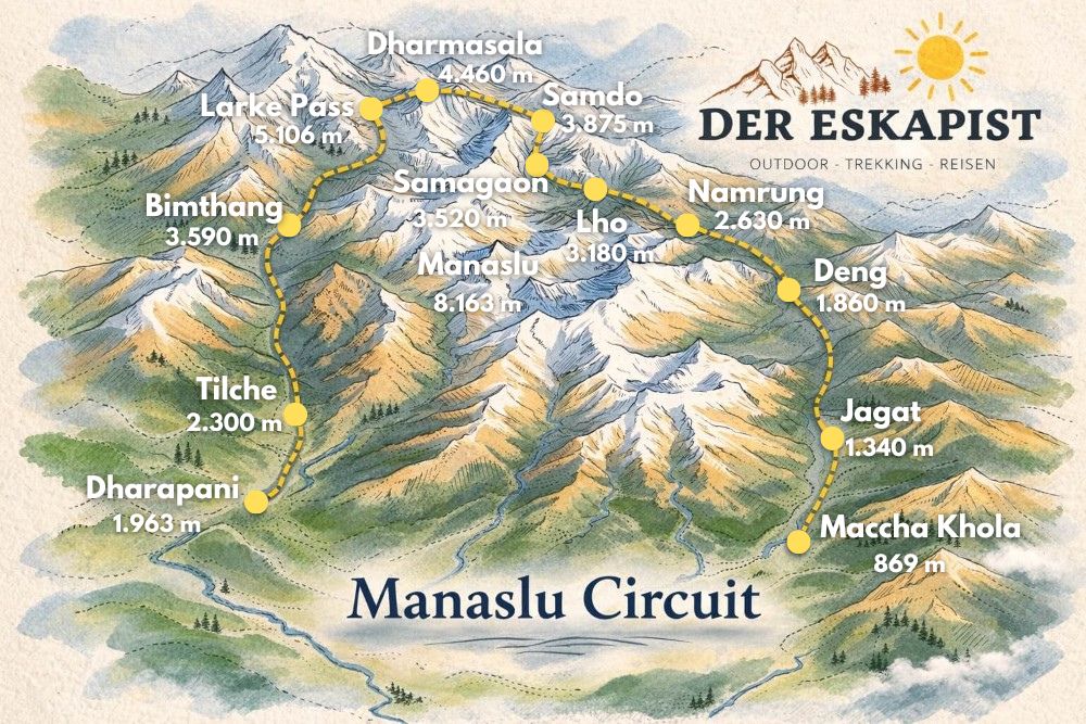 - Route und Etappen des Manaslu Circuit