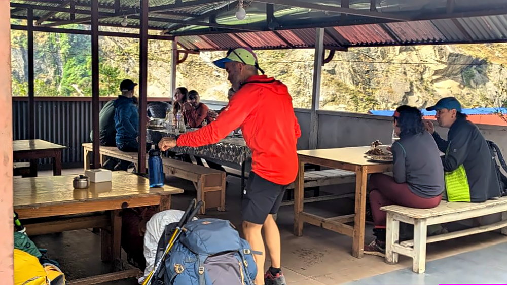 Das Abendessen ist sehr förmlich. Unser Guide Prakash nimmt die Bestellungen entgegen wie ein höflicher aber etwas distanzierter Kellner, setzt sich dann an einen anderen Tisch zu den übrigen Nepali-Guides. Hier die Einheimischen – da die Touristen. Ich komme mir angesichts dieser offen ausgelebten Zwei-Klassen-Gesellschaft ein bisschen komisch vor.