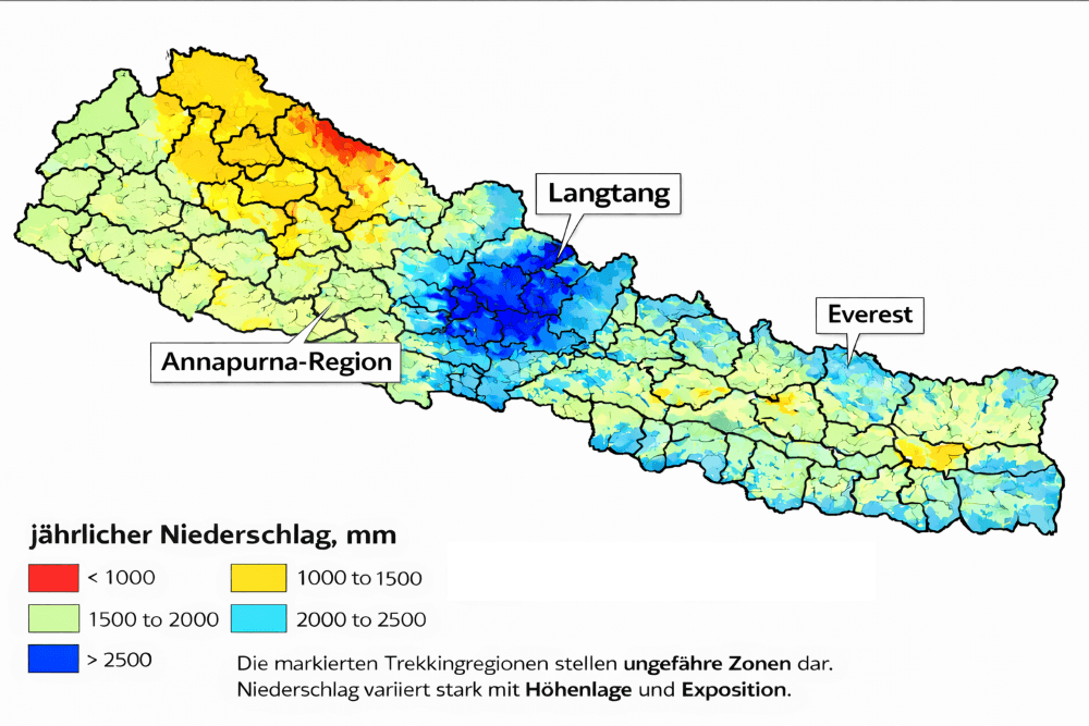 - 👉 Die Annapurna-Region liegt weiter westlich und erhält jährlich gesehen etwas weniger Niederschlag.