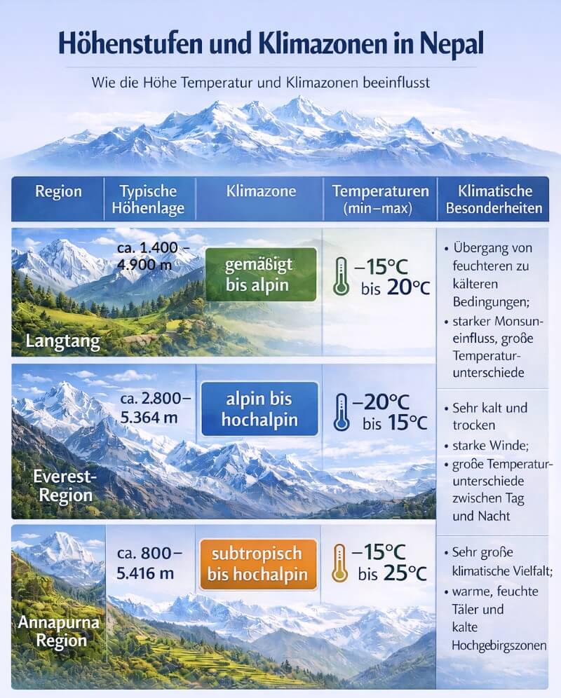 Nepals bekannteste Trekkingregionen liegen zwar alle im zentralen Himalaya, aber sie unterscheiden sich klimatisch. Dabei spielen die geografische Lage (West–Ost-Ausrichtung, Regenschatten) und die Höhenlage der jeweiligen Routen eine Rolle.