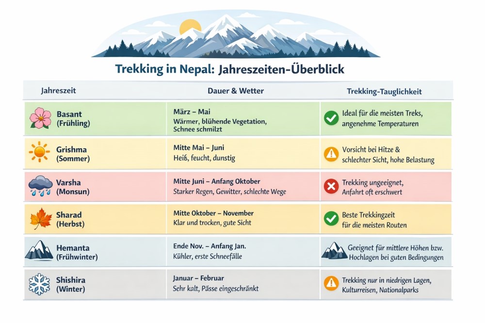 Übersicht und Eigenschaften der Jahreszeiten in Nepal (zum Vergrößern anklicken):