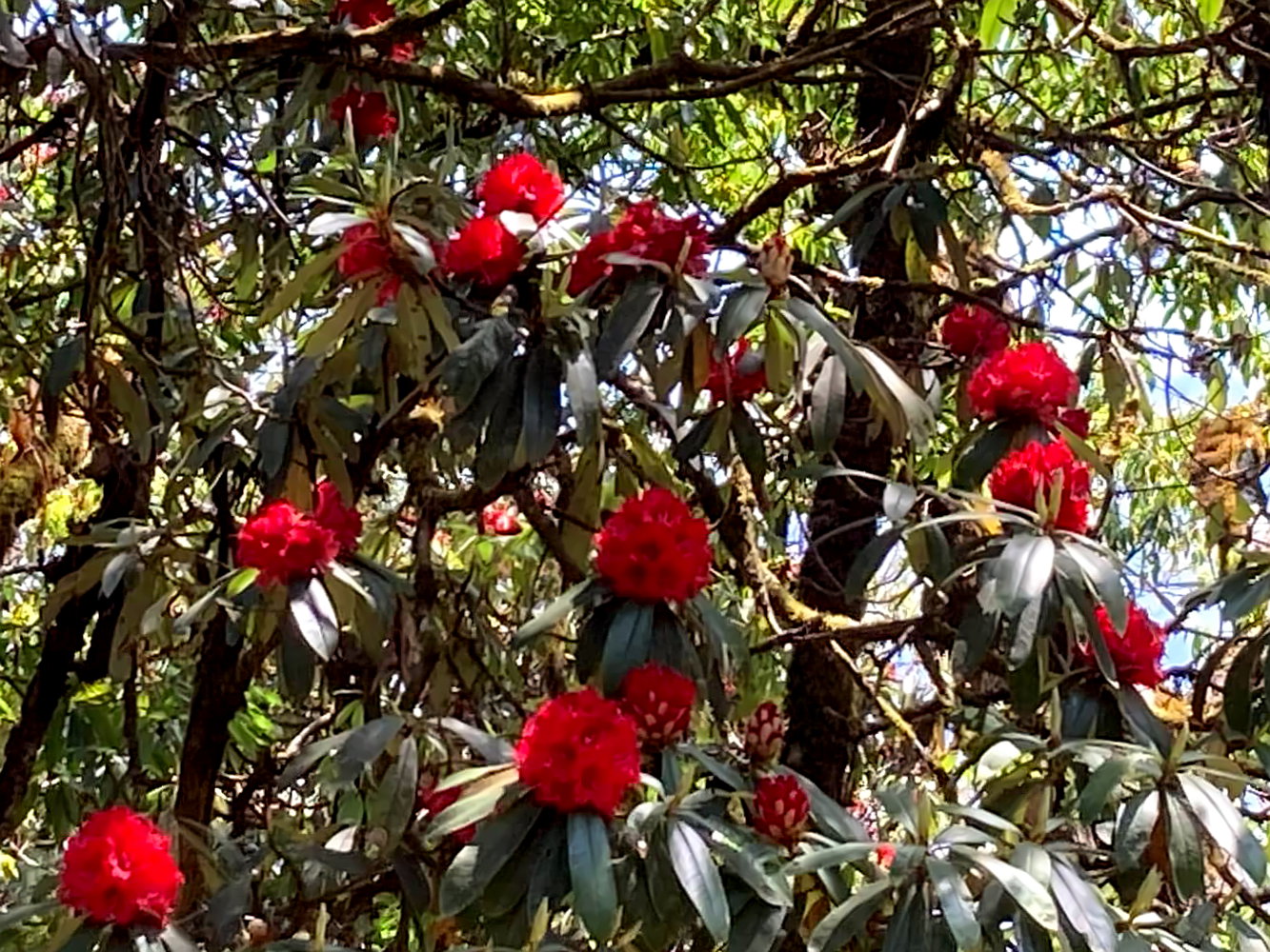 Am nächsten Morgen laufen wir zusammen weiter. Es geht genau wie gestern durch eine einmalig schöne Landschaft aus blühenden Rhododendron-Wäldern weiter. Die Dimensionen sind beeindruckend. Was bei uns in Europa als kleines Zierpflänzchen im Blumentopf wächst, steht hier als massive, bis zu 10 Meter hohe Baum in der Landschaft. Auch die bunten Schmetterlinge, die träge in der schwülen Luft ihre Bahnen ziehen, sind riesig. Aus dem Augenwinkel sehen sie fast wie kleine Vögel aus.