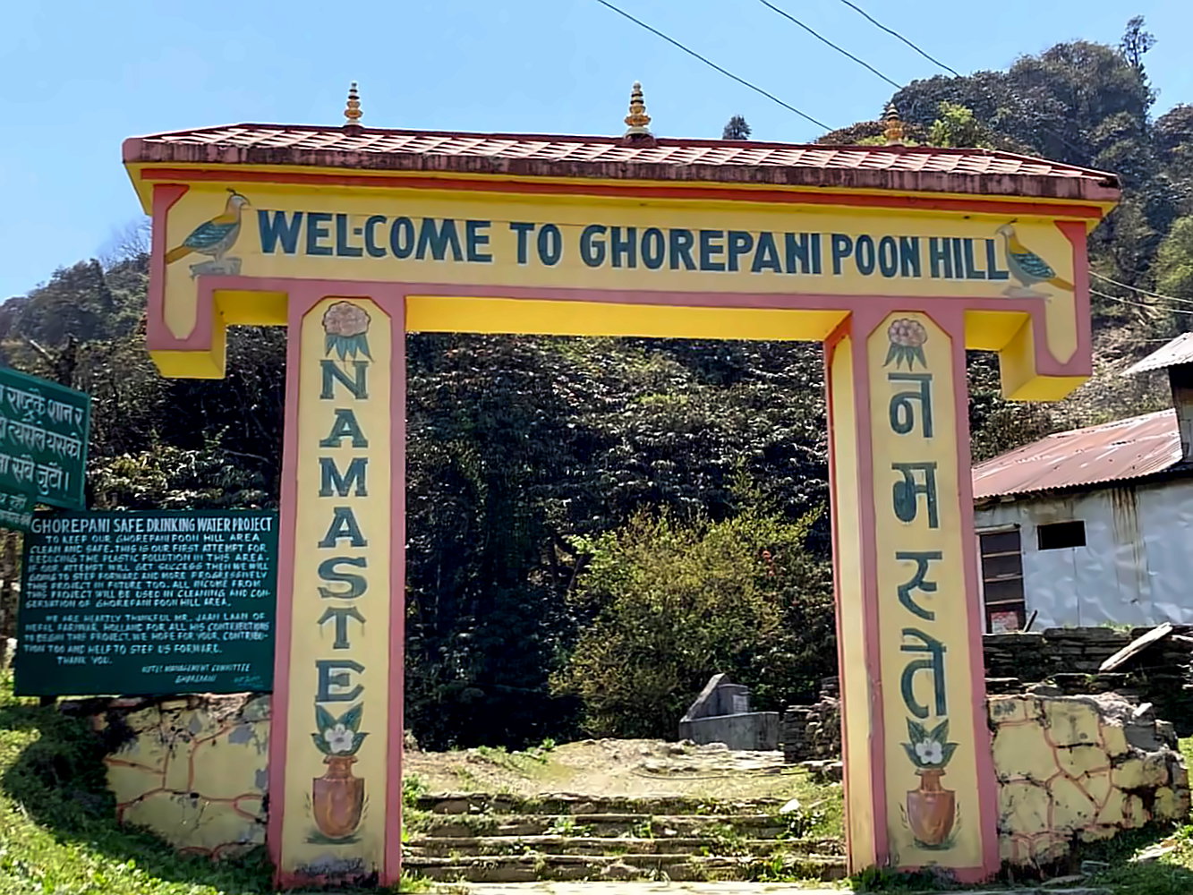 Nach zwei Stunden und knapp 500 Höhenmetern erreichen wir schließlich das Eingangstor von Ghorepani. Das Dörfchen ist eine kleine Hill Station, die auf einem windigen Pass liegt. Dementsprechend ist es hier oben angenehm frisch. Wenn Nepal jemals Teil des britischen Empires gewesen wäre, hätten sich die Kolonialherren im Sommer vermutlich hier oben auf diesem Hügel aufgehalten, um der schwülen Monsunluft zu entfliehen.