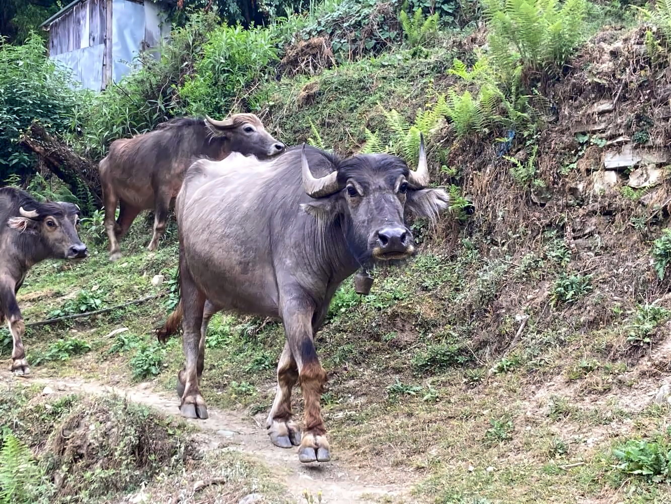 Bei Chitre beginnt der lange Anstieg zum Pass auf dem Ghorepani liegt. In der Ferne sehe ich die bunten Häuser im Dunst schimmern. Vorher geht es aber nochmal in den Wald, teilweise auch recht steil. Eine Herde von Wasserbüffeln kündigt sich mit bimmelnden Glocken an und blockiert den Weg bis ich sie wegscheuche. Später begegne ich einer alten Bäuerin, die einen riesigen Korb voller getrockneter Blätter auf dem Rücken trägt und sich im Schneckentempo den schmalen Treppenweg entlangkämpft.