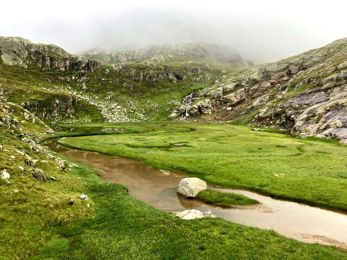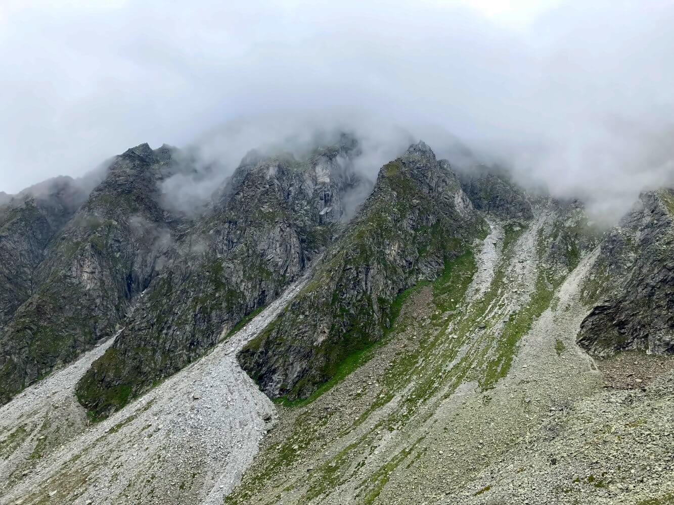 Den kurzen Abstecher zum Falbessoner See kann ich auf jeden Fall empfehlen. Mit dem Nebel, der an den Bergflanken entlang wabert, fühlt es sich hier fast ein bisschen wie in den schottischen Highlands an. Es gibt hier auch einen kleinen, nicht in der Karte eingezeichneten Trampelpfad, der anschließend zum Grawagrubennieder führt. Der 2.881 Meter hohe Pass wird in vielen Wanderführen als die schwierigste Stelle der Tour bezeichnet. Als ich ankomme, fängt es mal wieder an zu regnen. Let’s go…