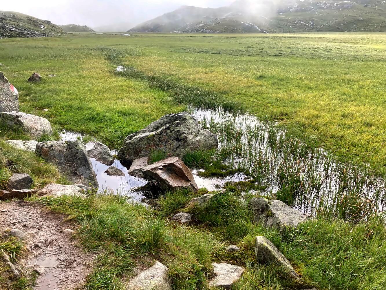 Hinter der Regensburger Hütte folgt der Stubaier Höhenweg zunächst ein ganzes Stück dem „Hohen Moos“, einer saftig grünen Moorlandschaft, die mit ihren kleinen Tümpeln einen tollen Kontrast zu den grauen Bergriesen bildet. Dass es in solcher Höhe Moore gibt, hatte ich nicht auf dem Schirm. Aber es macht schon Sinn – Wasser ist durch die Gletscher ja genug vorhanden. Auf jeden Fall bin ich froh, dass ich wasserfeste Schuhe trage, da man hier doch ziemlich oft durch den Matsch stapft.