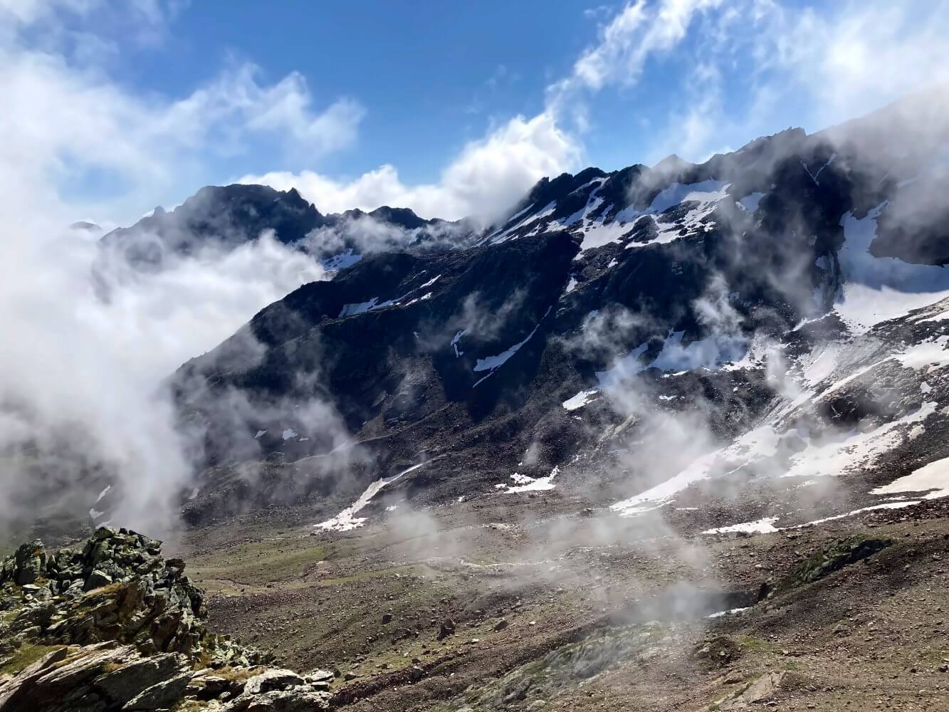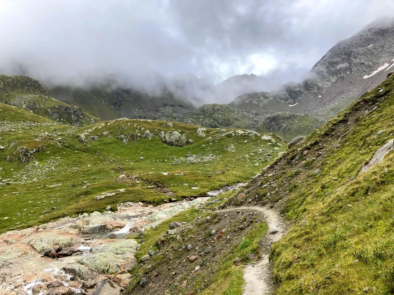 Als ich den Pass auf knapp 2.700 Metern erreiche, fängt es an zu nieseln. Den kurzen Abstecher zum Baslerjoch (2.829 m, ca. 30 Minuten) spare ich mir deshalb, zumal man eh immer weniger sieht. Der Abstieg vom Pass ist zum Glück nicht so steil, auch wenn man immer wieder kleiner Felsbrocken überwinden muss. Eine dreiviertel Stunde später wird das Gelände dann etwas flacher.