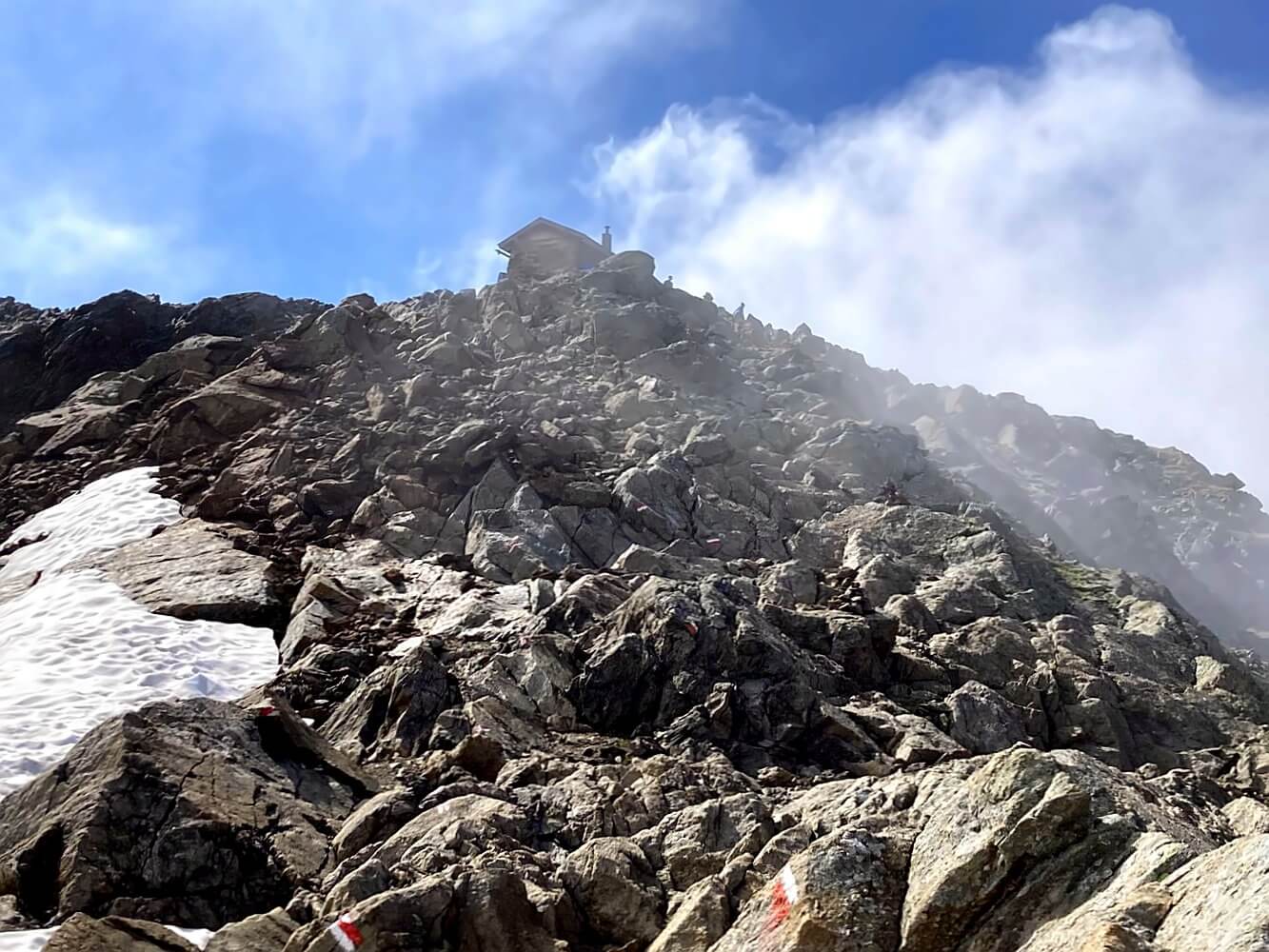 Richtig bequemes Wandergelände ist es nicht und es gibt kurz vor dem Grat auch nochmal eine schön ausgesetzte Stelle. Dafür ist das Ganze wie immer gut mit Drahtseilen gesichert. Bei gutem Wetter dürfte es eigentlich unproblematisch sein. Eine kurze Kraxelei durch Blockwerk später erreiche ich die Nürnberger Hütte, die wie eine Trutzburg in den grauen Geröllfeldern wirkt.