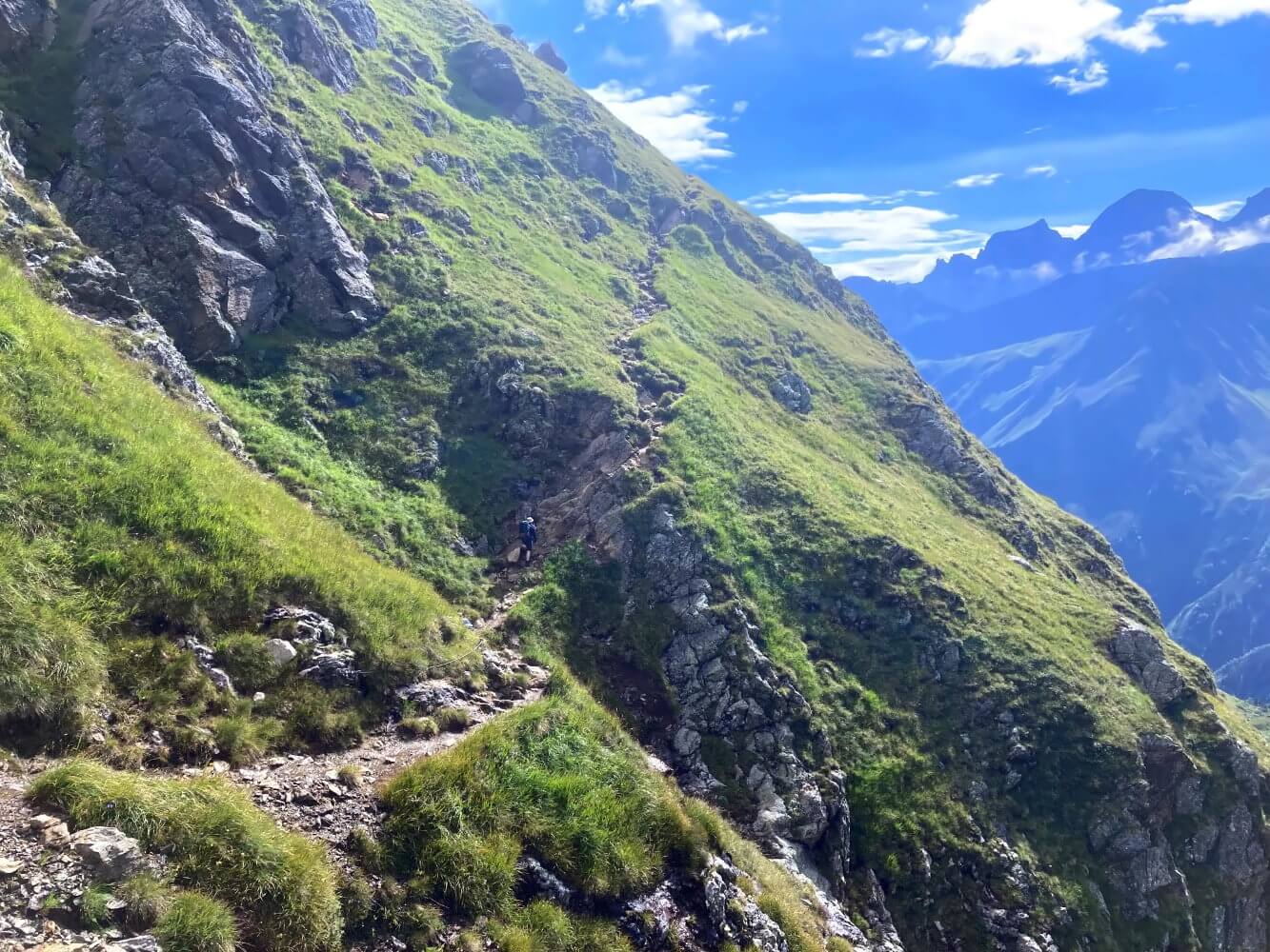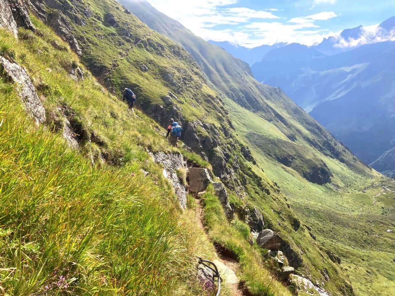 Danach geht es aber auch schon wieder an den Ernst des Lebens – den langen Abstieg vom Pass. Ich fand diese Stelle unangenehmer als den Grawagrubennieder, der ja gerne als Schlüsselstelle der Tour bezeichnet wird. Es ist alles wieder gut gesichert, aber die Tritte liegen teilweise doch recht weit auseinander. Zum Glück scheint die Sonne – bei schlechtem Wetter macht das bestimmt keinen Spaß.