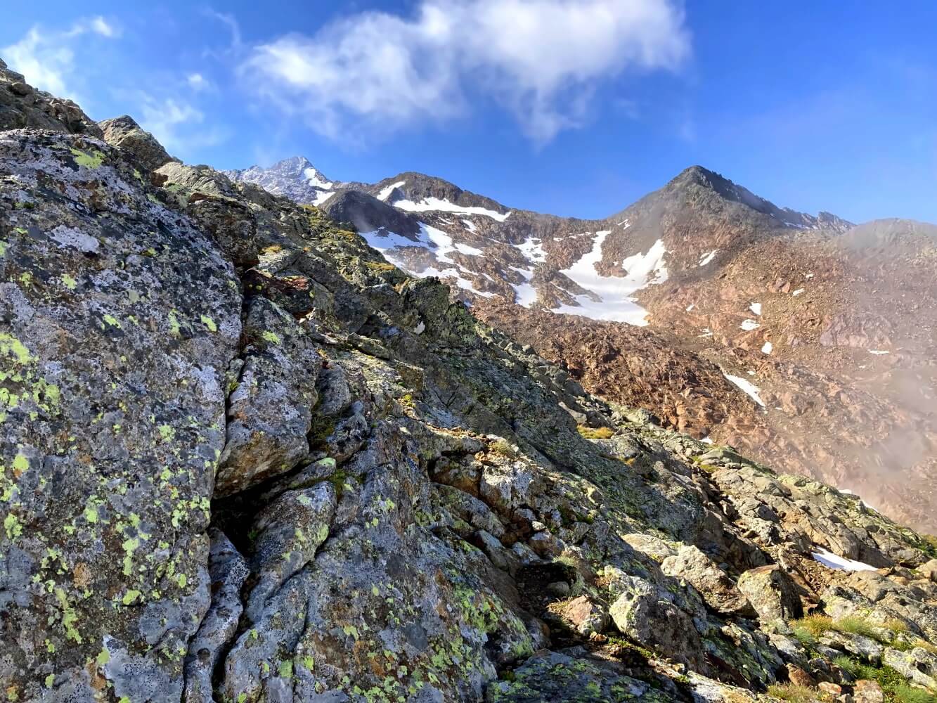 Zu meiner Überraschung stellt sich der Übergang dann doch harmloser heraus, als ich zuerst gedacht habe. Der Zustieg erfolgt wieder durch grobes Blockwerk, wie immer ist der Weg aber perfekt markiert. Kurz bevor es steil wird, sehe ich vor mir eine alte kreisrunde Markierung, der ich irrtümlich folge. Als ich erkenne, dass ich falsch bin, habe ich keine Lust zurückzulaufen und kraxele das restliche Stück einfach so hoch. Schließlich muss ich ja die gerade gelernten Skills aus dem Hochtourenkurs anwenden…