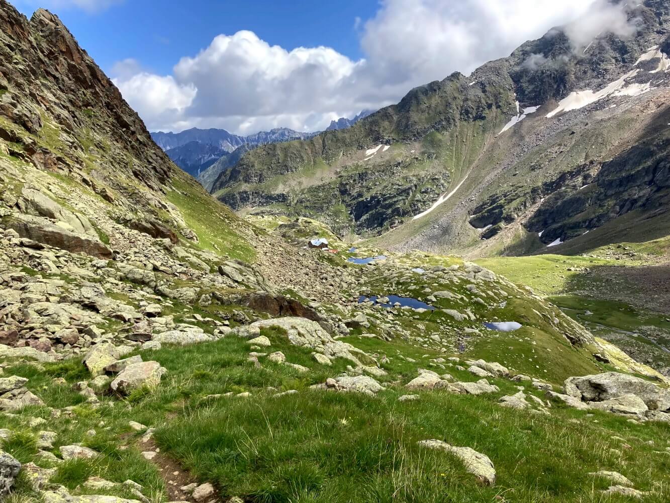 Danach wird es dann aber wieder einfacher, während der Weg einem langgezogenen Hochtal bis zu Bremer Hütte folgt. Immer mal wieder ziehen Wolken durchs Bild, aber das Wetter scheint tatsächlich zu halten. Ich genieße die tollen Ausblicke und viel zu schnell taucht die idyllisch zwischen Tümpeln und Moorwiesen gelegene Bremer Hütte am Horizont auf.