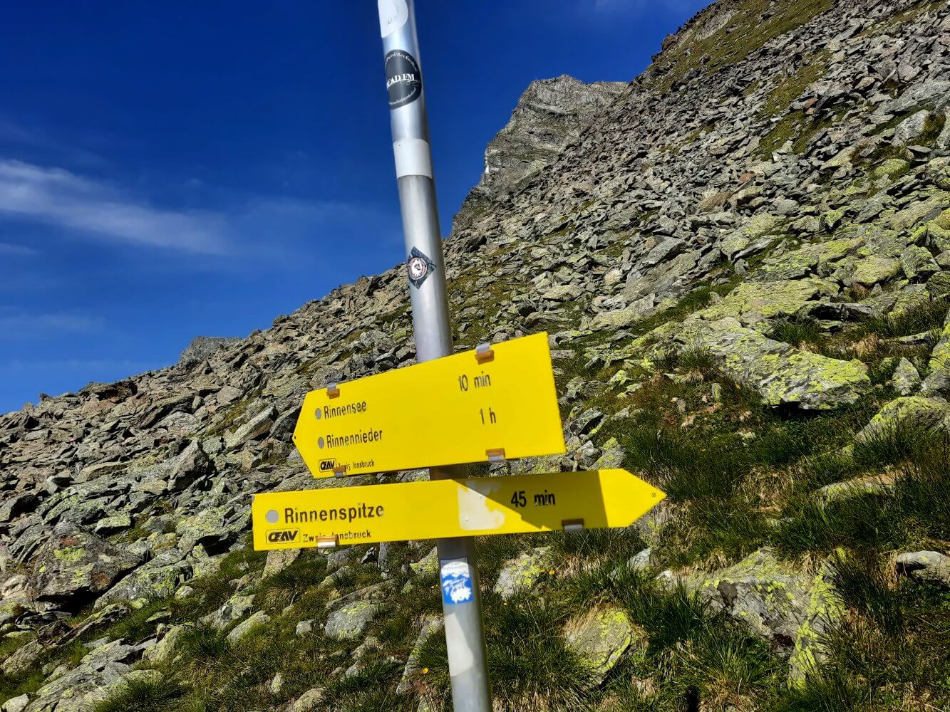 Bis zur Abzweigung zum Rinnensee (2.646 m) ist alles noch im grünen Bergwander-Bereich (T3). Der Weg ist gut instand gehalten und ausreichend breit, sodass nichts passieren kann, wenn du vorsichtig bist. Hinter dem Wegweiser geht es dann zunehmend steiler durch die Blockfelder, es bleibt aber immer noch ein Wanderweg. Etwa 10 Minuten später erreichst du dann die Felsplatten mit den ersten Steigbügeln.