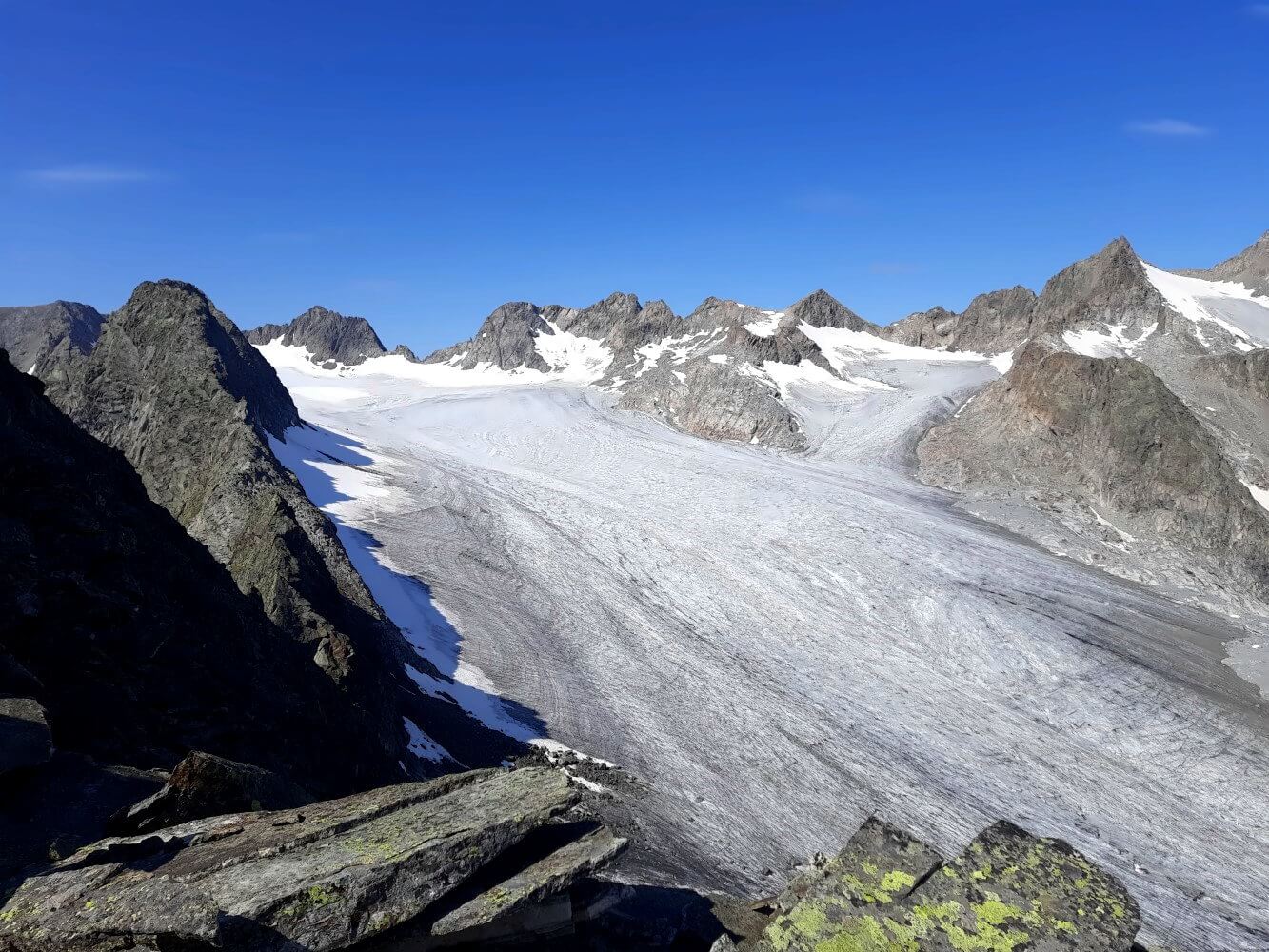 Oben angekommen suchst du dir am besten ein windgeschütztes Plätzchen und genießt den genialen Ausblick auf den Rinnensee im Süden und den gewaltigen Lüsener Ferner im Nordwesten. Die Aussichten auf den Gletscher sind wirklich eine Wucht und er fühlt sich zum Greifen nahe an. Als wir oben waren, wurde es leider sehr schnell sehr voll, sodass es gar nicht mehr so leicht war in dem steilen Gelände einen guten Platz zu finden.