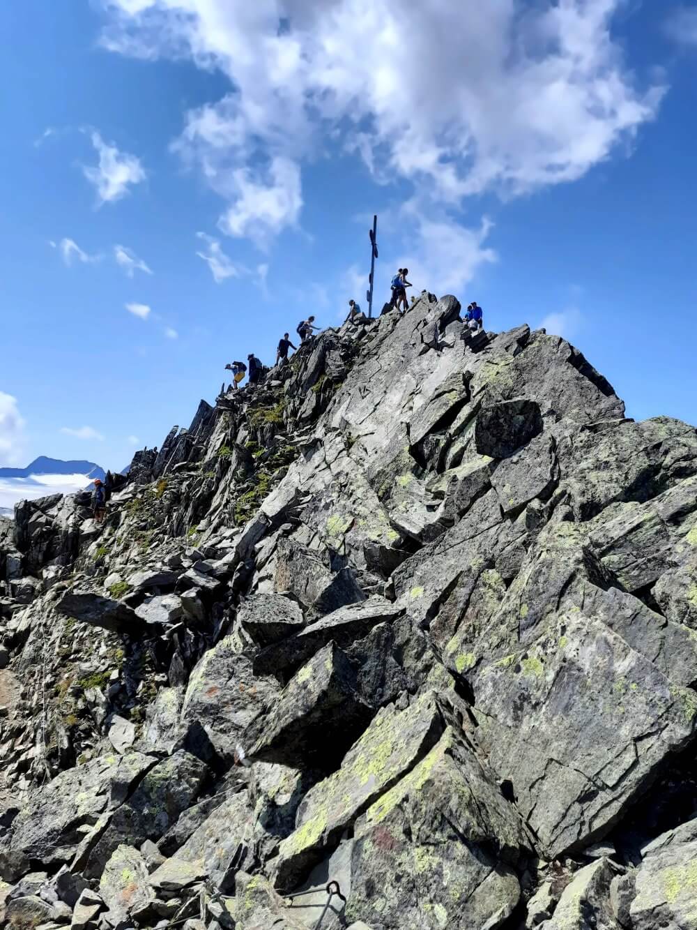 Die letzten 100 Höhenmeter sind dann wahrscheinlich so etwas wie die Schlüsselstelle der Bergtour auf die Rinnenspitze. Die Route führt über einen groben Blockgrat (T4), wo es eigentlich keinen richtigen Weg mehr gibt, nur noch Markierungen, Drahtseile und Drahtbügel an den steileren Stellen. Einige Touren-Berichte bezeichnen diese Stelle als Klettersteig. Kann man so sehen, aber wenn dann ist es ein leichter A/B-Steig.
