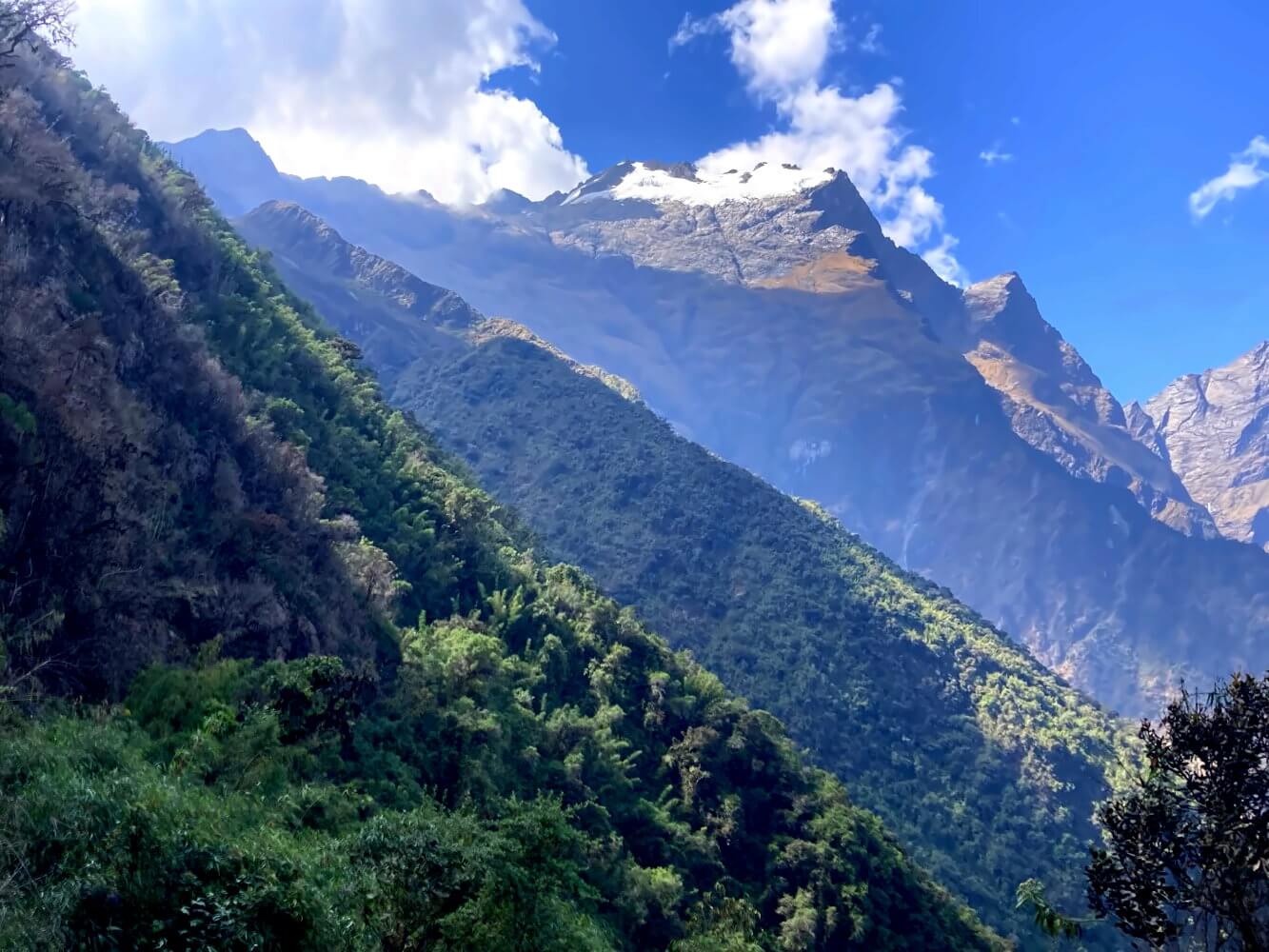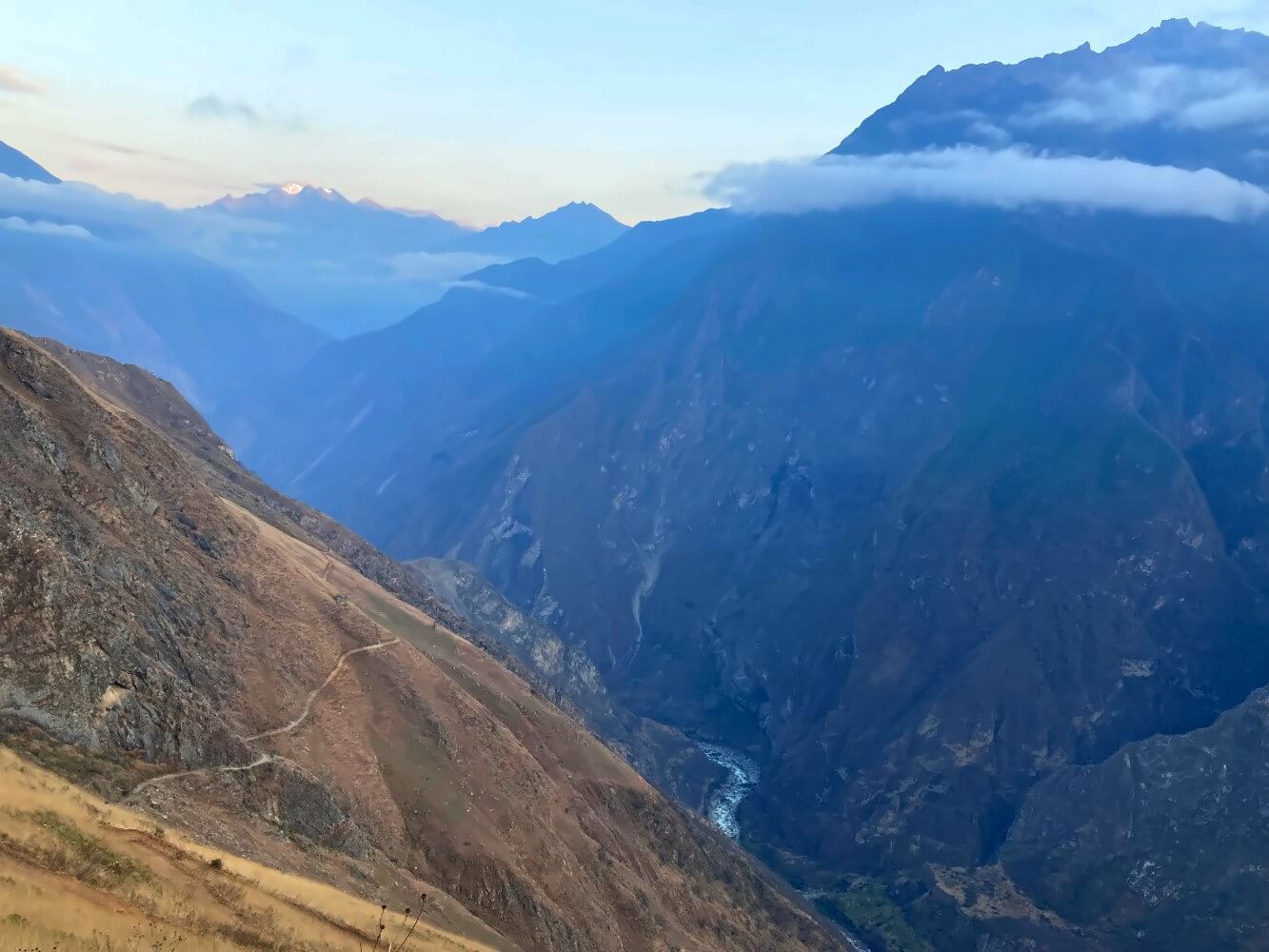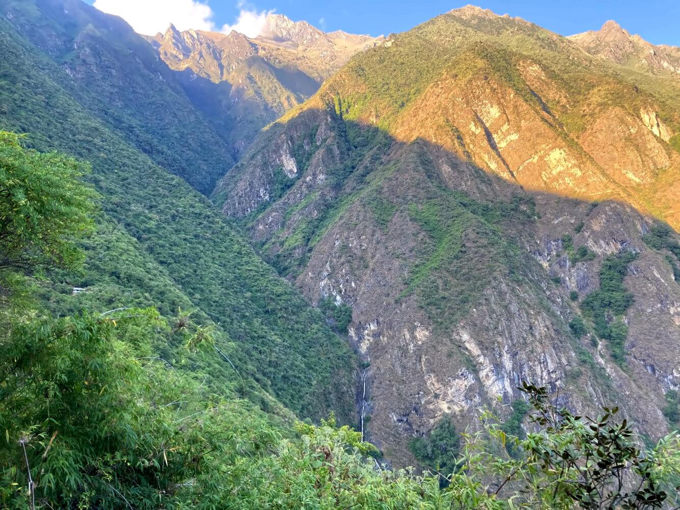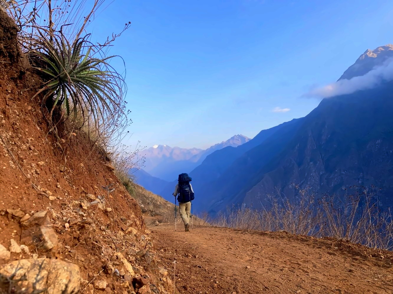 Die ersten paar Stunden auf dem Trek sind tatsächlich recht entspannt. Über unzählige Serpentinen windet sich der breite Weg in die Schlucht hinein. In der kühlen Morgenluft ist das Laufen angenehm, die Aussichten sind grandios. Auf der anderen Talseite funkeln die Gletscherberge der Cordillera Vilcabamba in den ersten Strahlen der Morgensonne, Wolkenfetzen ziehen zwischen den Gipfeln umher. Ich komme gut voran.