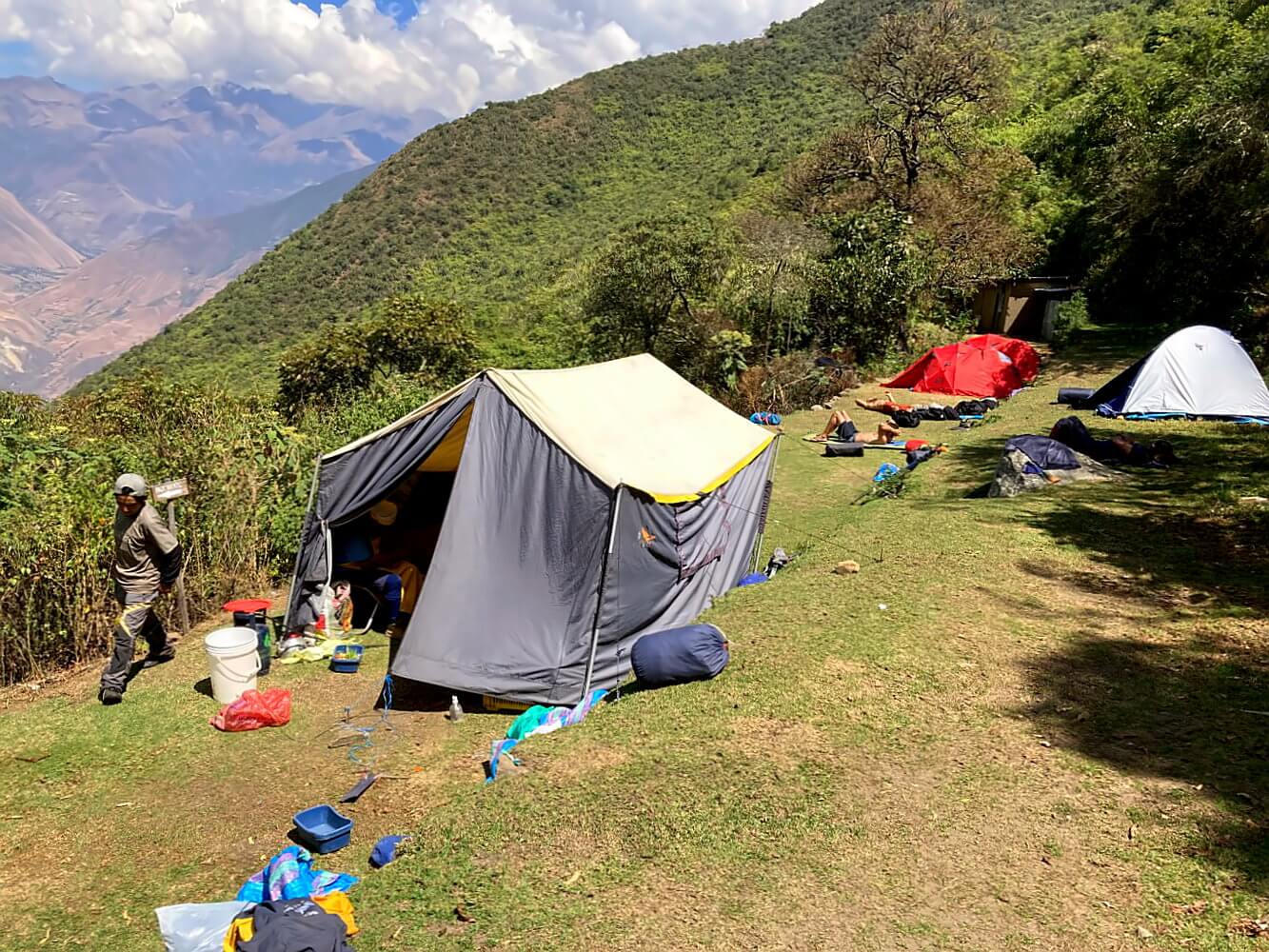 Noch eine halbe Stunde dann habe ich den schönen Zeltplatz erreicht, der sich ebenfalls auf Terrassen befindet. Eine Gruppe ist bereits da, aber es sind nur ein paar Zelte. Später wird mein Ticket kontrolliert, die Wärter haben nebenan eine kleine Hütte. Aber hier geht alles sehr gemächlich zu, „todo tranquilo“. Niemand hat es mit irgendwas eilig. Internet gibt es auch nicht und bis auf eine Dusche und ein Klo auch sonst keine Einrichtungen.