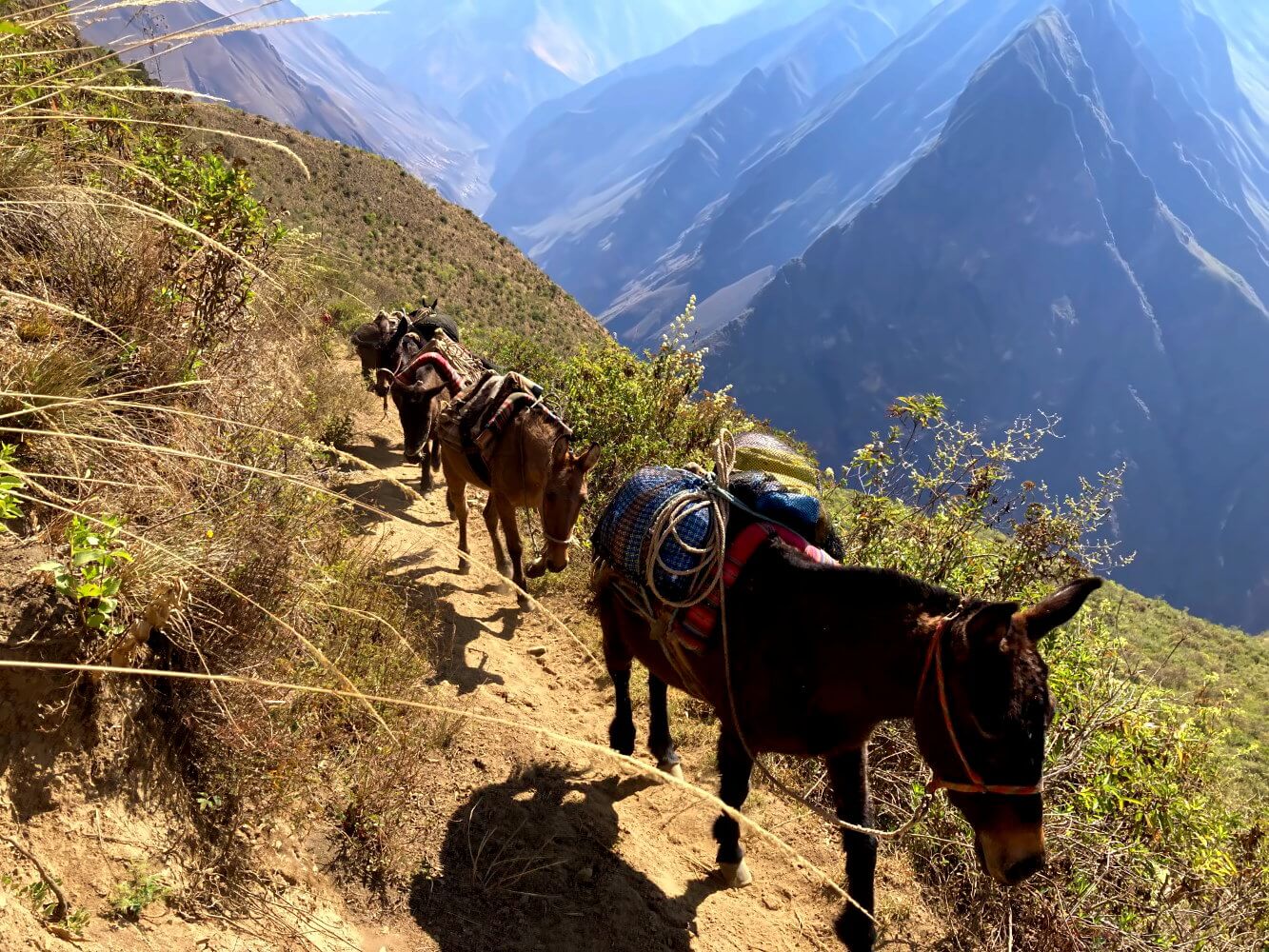 Ich stehe am Rand der tiefsten Schlucht, die ich je in meinem Leben gesehen habe und schaue nach unten. Da will ich wirklich runter? Und direkt auf der anderen Seite wieder rauf? In der Tiefe windet sich der Rio Apurímac durch den Canyon, ein schmales weißes Band .“El senór que habla“, der „Große Sprecher“, so nannten die Inka den rauschenden Fluss. Von meiner Warte ist davon freilich nichts zu hören. 1.500 Höhenmeter liegen zwischen mir und dem Grund der Schlucht.