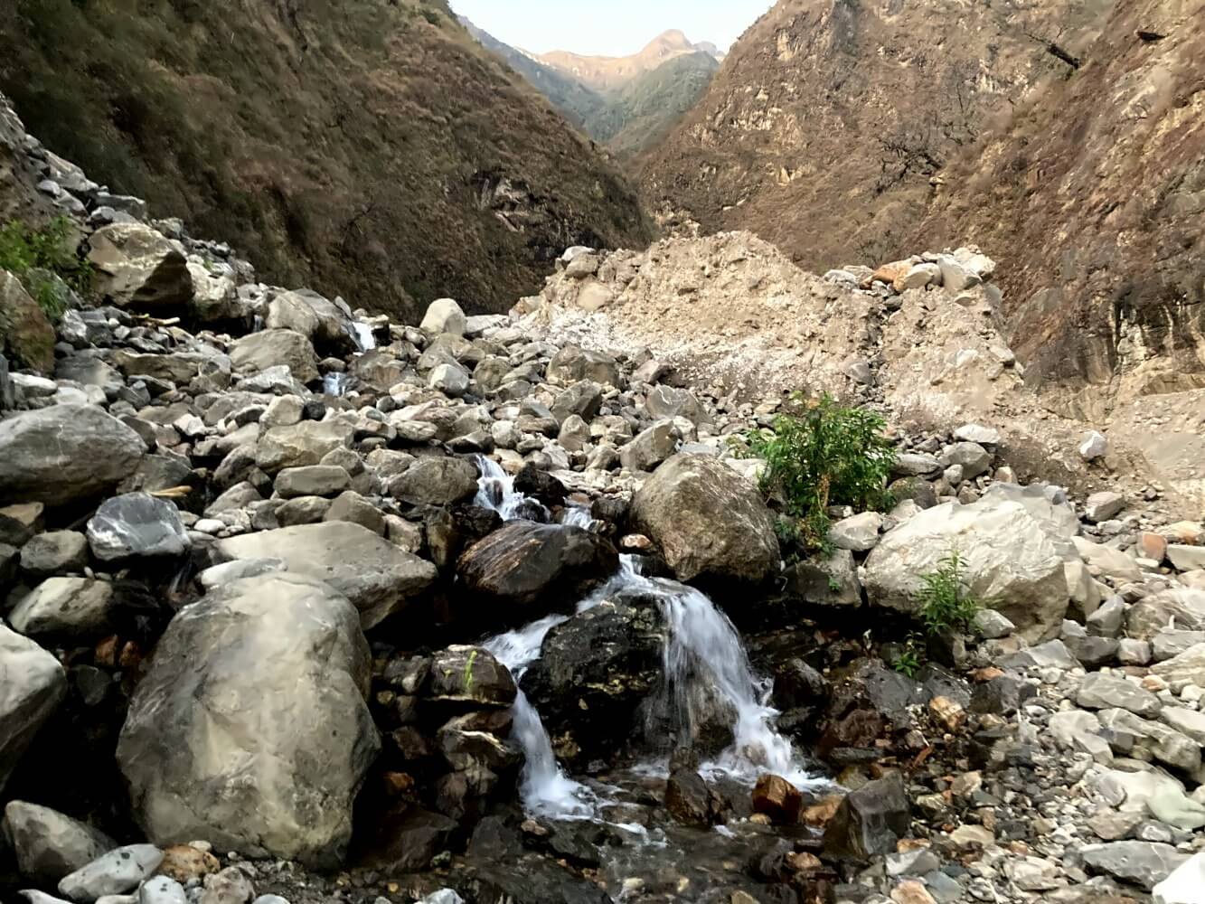 Wenn es eine Entschädigung gibt: Die Aussichten in die wild zerklüftete Schlucht des Rio Blanco werden mit jedem Meter besser, den man aufsteigt. An dem Punkt, an dem der Canyon auf ein weiteres Flusstal trifft, schiebt sich eine riesige, mehrere hundert Meter hohe Barriere aus Fels und Erde die Berghänge hinab. Wie eine Art natürliche Staumauer, die das Tal blockiert. Kaum vorstellbar, dass so etwas auf natürliche Weise entstehen kann.