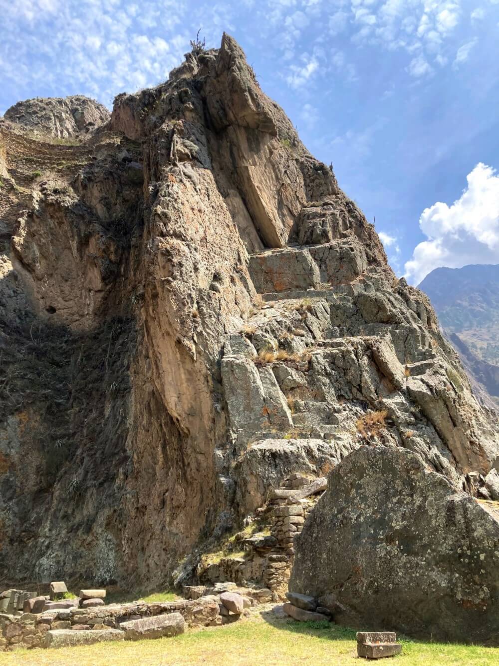 Der gesamte Komplex wurde nie fertiggestellt. Vielleicht kamen die Bauarbeiten zum Erliegen, als die Inka vor den Spaniern flohen. Im unteren Bereich liegen viele der riesigen Steinblöcke verstreut im Gras. Auch der zentrale Sonnentempel ganz oben besteht nur aus einem halbfertigen Altar und einer großen Monumental-Mauer, der „Mauer der sechs Monolithen“. Als Gesamtkunstwerk ist die Anlage trotzdem beeindruckend – die Präzision, mit der die tonnenschweren Steinblöcke bearbeitet wurden, ist schier unglaublich.