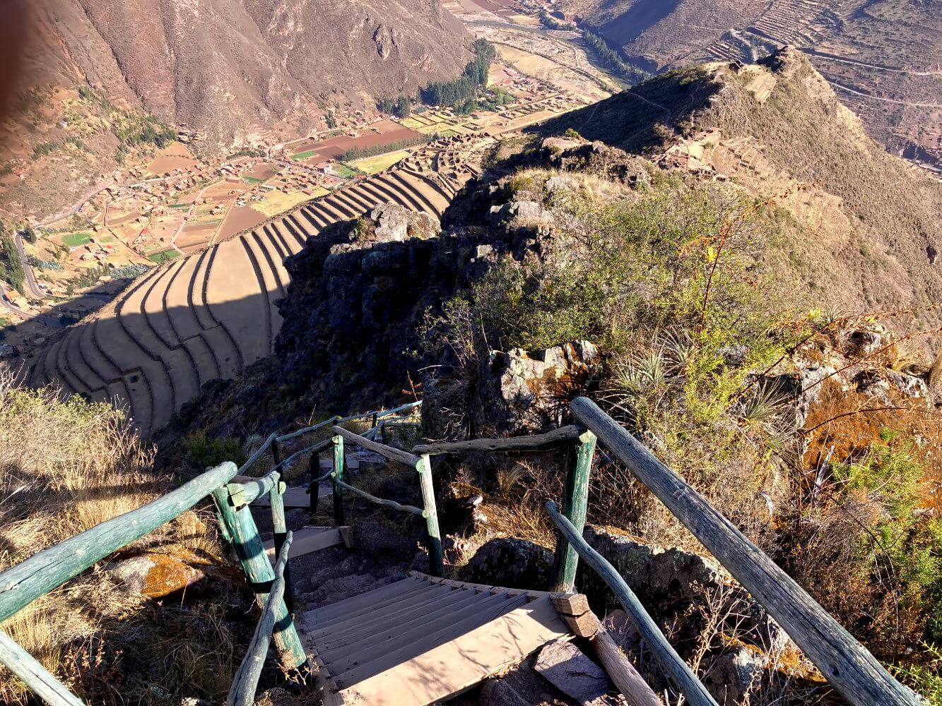 Damit ist die Wanderung fast zu Ende. Ein letzter steiler Abstieg führt über Holzstufen zu einem gepflasterten Feldweg, der ein paar Minuten später in die Calle Intihuatana mündet. Hier trifftst du dann auf einige Souvenirstände, an denen dir freundliche Quechua-Damen Hüte, Schals und ähnlichen Nippes andrehen wollen (und ja… ich hab mich breitschlagen lassen). Anschließend sind es noch ein paar hundert Meter bis zum Hauptplatz von Pisac.