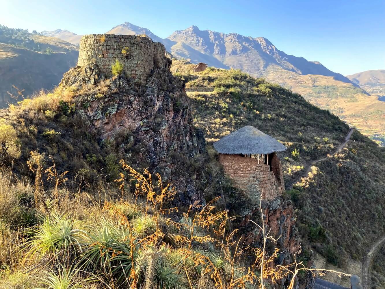 Was sich auch lohnt: Ein Abstecher zum Sonnentor „Inti Punku“ auf einem Hügel auf dem höchsten Punkt des Komplexes. Das ist ausgeschildert und liegt quasi auf dem Weg. Dort oben steht auch eine kleine Hütte, die Schatten spendet und es gibt ein paar Bänke zum Ausruhen. Außerdem hast du hier natürlich einen Superblick den Berg herunter bis zum modernen Pisac.