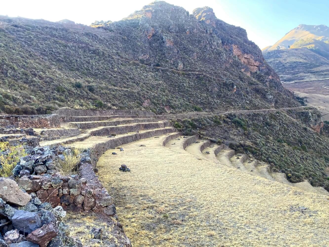 Der ausgeschilderte Hauptweg führt am Hospitalniyoc-Komplex vorbei absteigend durch die Berghänge. Dieser Abschnitt ist nochmal sehr schön. Zunächst kommt eine lange Querung der Bergflanken auf einer Art Höhenweg, der absolute Traumblicke ins Tal bietet. Am Ende läufst du dann mitten zwischen zwei riesigen Terrassen-Komplexen hindurch – ein tolles Highlight zum Schluss.