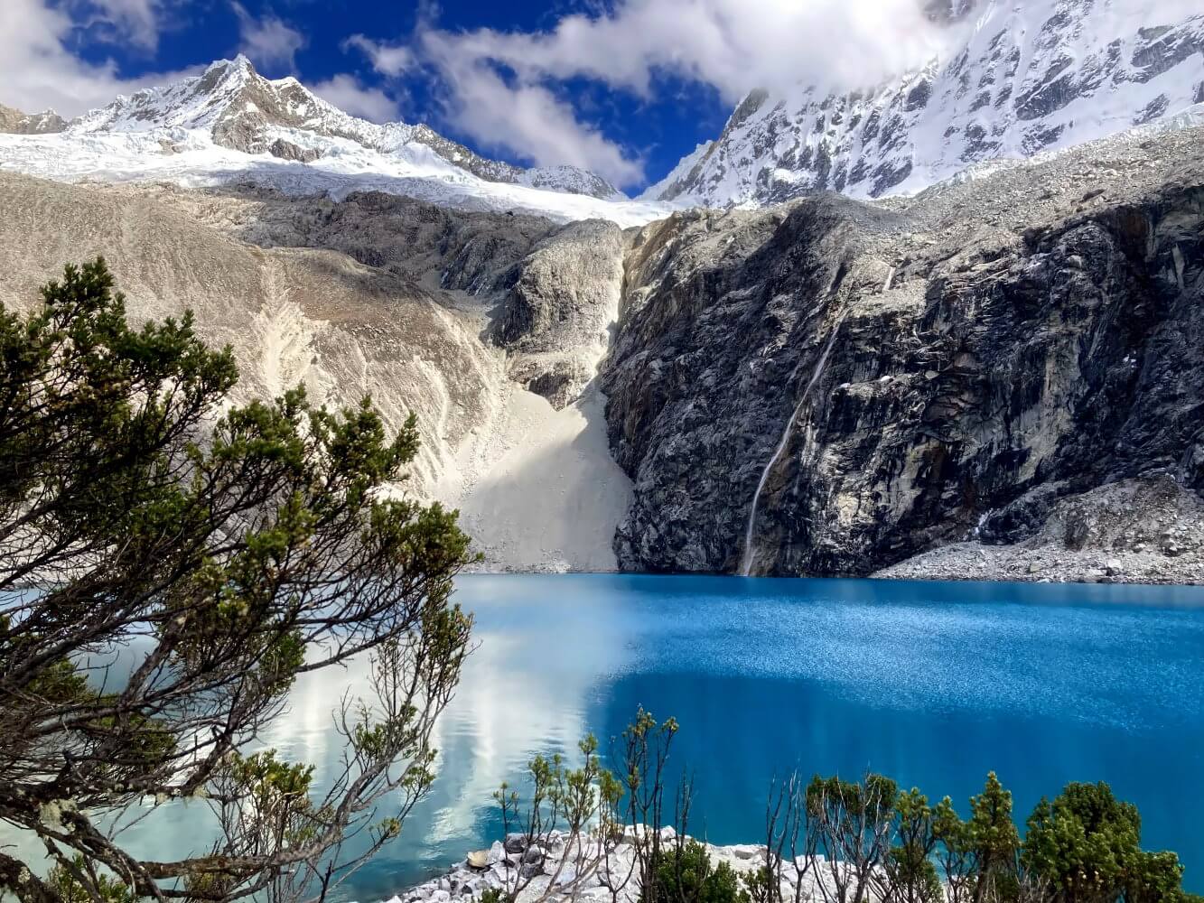 Auf 4.600 Metern angekommen wird es dann endlich wieder flach. Jetzt sind es noch ein paar Meter auf einem steinigen Trampelpfad, dann hast du es geschafft: Die Laguna 69, unser zweiter See des Tages, breitet sich vor dir aus. Der See liegt in einem engen Moränen-Kessel. Dahinter stürzen die Wasserfälle von den Gletschern in den See. Der linke Gipfel über dem See ist der Nevado Pisco (5.752 m), der rechte der Nevado Chacraraju (6.108 m).