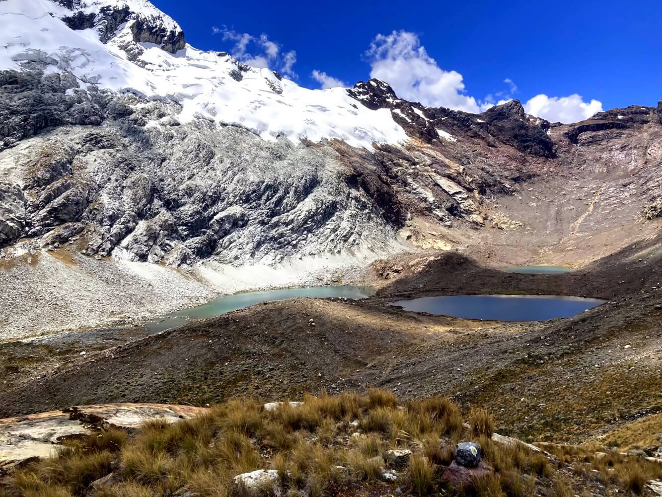 Der Panoramaweg führt zu fünf weiteren kleinen Gebirgsseen und verläuft in den Berghängen weit über dem Tal, in dem du aufsteigst. Daher hast auf dieser Route noch einmal komplett andere Aussichten auf die zahlreichen Gletscherberge der Cordillera Blanca. Viel bessere Aussichten, weil du dich in größeren Höhen bewegst und die Berge besser sehen kannst.