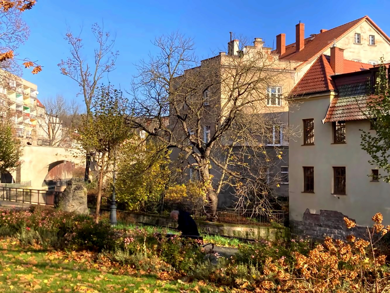 Der Marktplatz befindet sich kurz hinter der Brücke und ist das Zentrum der Altstadt. In der Mitte des Platzes befindet sich eine hübsche Marienstatue aus Sandstein, ringsherum schöne alte Häuser aus der Gründerzeit und das Rathaus. Ein paar Minuten entfernt liegt die alte Pfarrkirche mit dem schlanken Kirchturm, den man von allen Ecken der Stadt sieht. Als wir da waren, hatte die Kirche leider geschlossen. In den alten Gassen der Altstadt herumzuspazieren hat aber auch ohne konkretes Ziel Spaß gemacht.