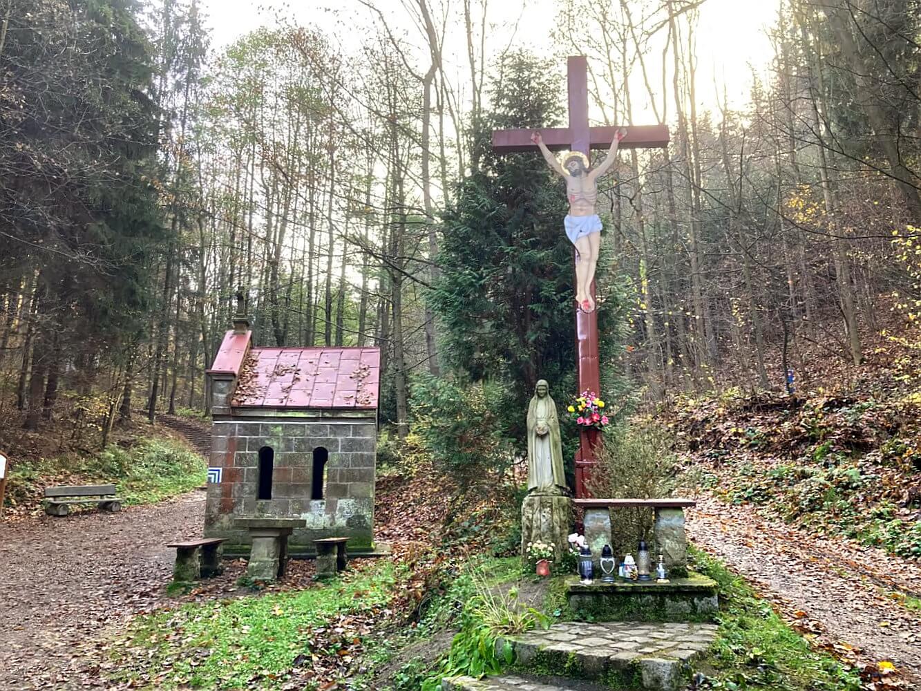 Vom Aussichtspunkt geht es weiter auf einem Kreuzweg mit den üblichen Stationen. An einem kleinen Häuschen mit einem hübsch verzierten Jesus am Kreuz zweigen links weitere Treppen ab. Von hier ab bis zum Aussichtsturm am Klodzka Góra ist der Weg durchgängig blau-weiß markiert. An dem Häuschen gibt es sogar ein Schild mit den Attraktionen in der Umgebung. Demnach laufen wir gerade den „Kapellenberg“ hoch.
