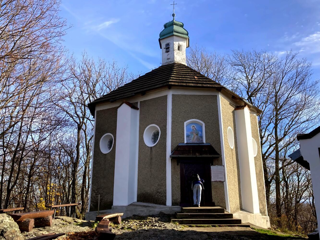 Nächste Station ist dann auch die besage Kapelle auf 583 Metern. Das Steingebäude selbst ist verschlossen, aber man kann durch die Tür in den Altarraum reinschauen. Hinter dem Haus befindet sich ein steinerner Fußabdruck der Mutter Gottes auf einem Felsen, die sich hier angeblich im 14. Jahrhundert den Gläubigen offenbarte (leider mit einem Gitter verbarrikadiert, ich frag mich wirklich, wer so etwas beschädigen will…) Außerdem gibt es eine schöne Bank, von der aus man den ersten richtig guten Panoramablick auf den Glatzer Kessel im Osten hat.