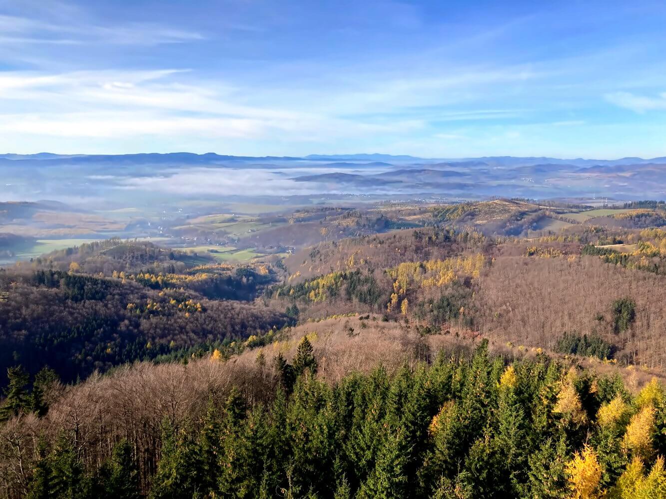 Der Aussichtsturm auf dem Klodzka Góra gibt einen beeindruckenden Anblick ab und er ist auch ziemlich hoch – etwa 25 Meter. Die Aussicht von dort oben ist absolut genial. Der komplette Glatzer Kessel liegt einem hier zu Füßen. Als wir oben sind, hält sich der Nebel in den Tälern immer noch beharrlich – ein faszinierendes Schauspiel, und ich komm mir schon ein bisschen wie der berühmte „Wanderer über dem Nebelmeer“ vor.