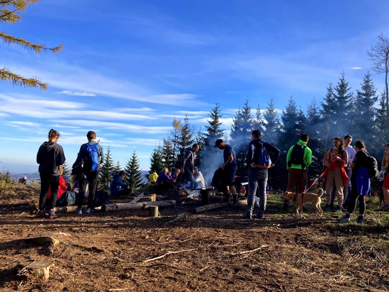 Einige Zeit später erreichen wir die Straße, die wir aber nur kurz überqueren. Hier befindet sich ein Parkplatz, weil es in der Nähe einen Singletrack für Mountain-Bikes gibt. Dementsprechend wird es auf dem nächsten Abschnitt kurz etwas belebter. Was aber auch nicht viel heißt: Uns begegnen vielleicht 20 Leute auf dem Weg zum Aussichtsturm, meistens Einheimische, die mit ihrer Familie zum Klodzka Góra hochpilgern.