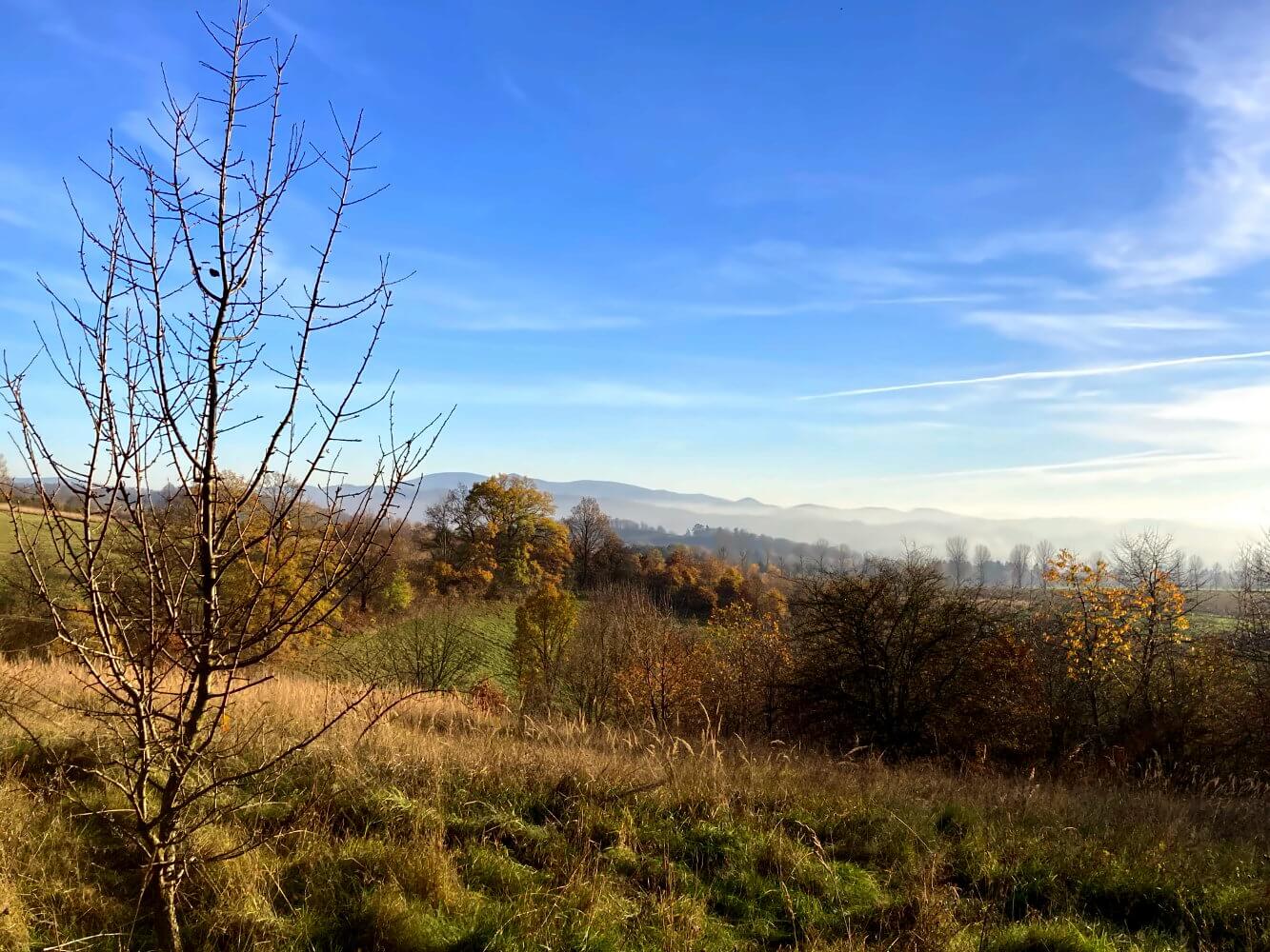 Als wir frühmorgens in Bardo ankommen liegt das Dorf noch unter dichtem Nebel und jetzt – Mitte November – ist es auch schon ziemlich kalt. Wir überqueren die Gleise auf einer Brücke, und schlagen uns auf einem halboffiziell aussehenden Weg ein paar Treppen den nächsten Hügel hoch. Hundert Meter weiter rechts an der Straße zweigt ein Weg in die Wälder ab, dem wir folgen.